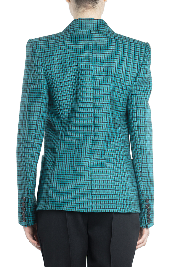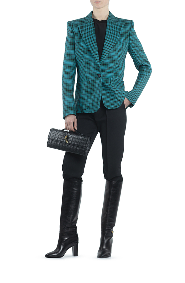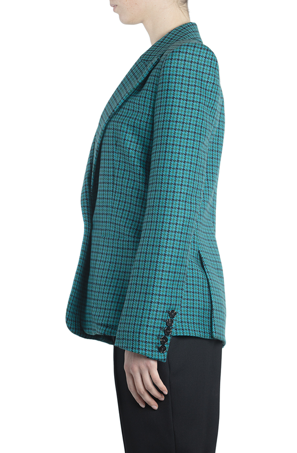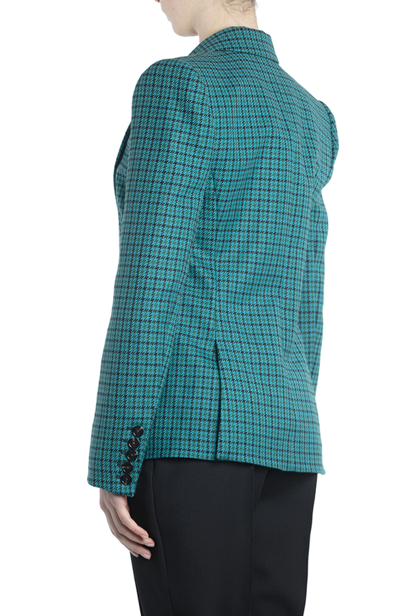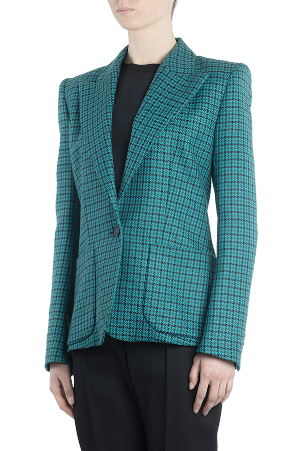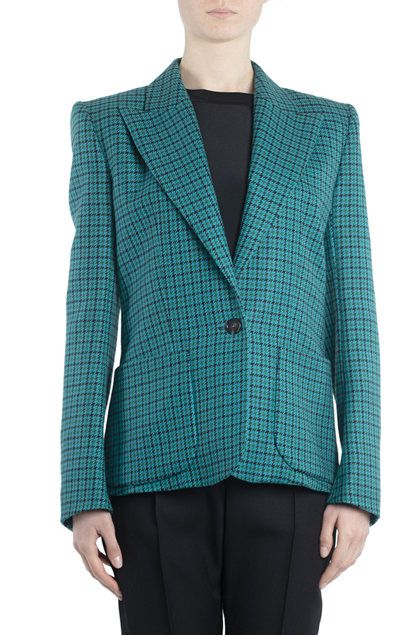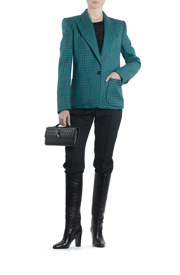 - Вовняний блейзер з візерунком. Застібання на один гудзик, довгі рукави, манжети на гудзиках, дві бічні накладні кишені.