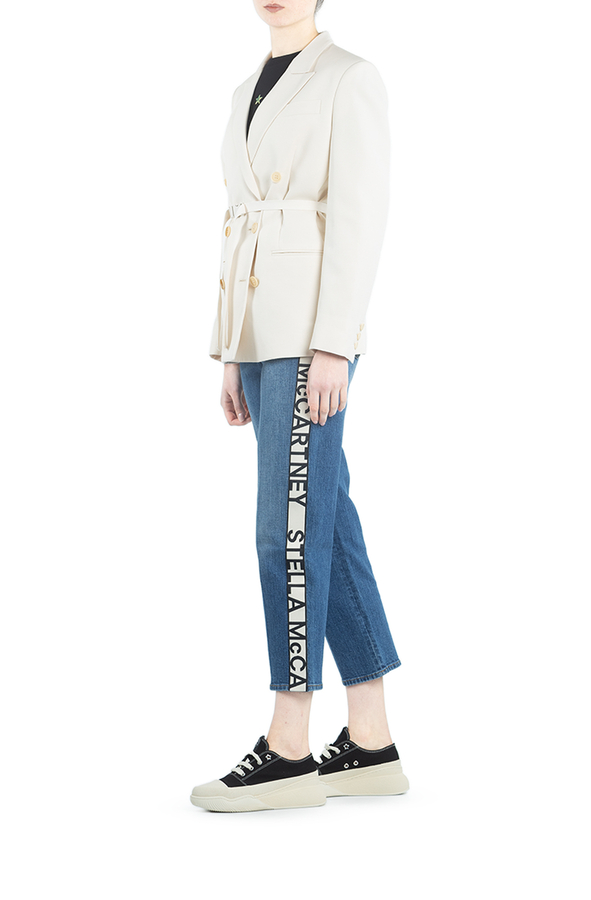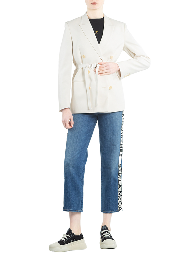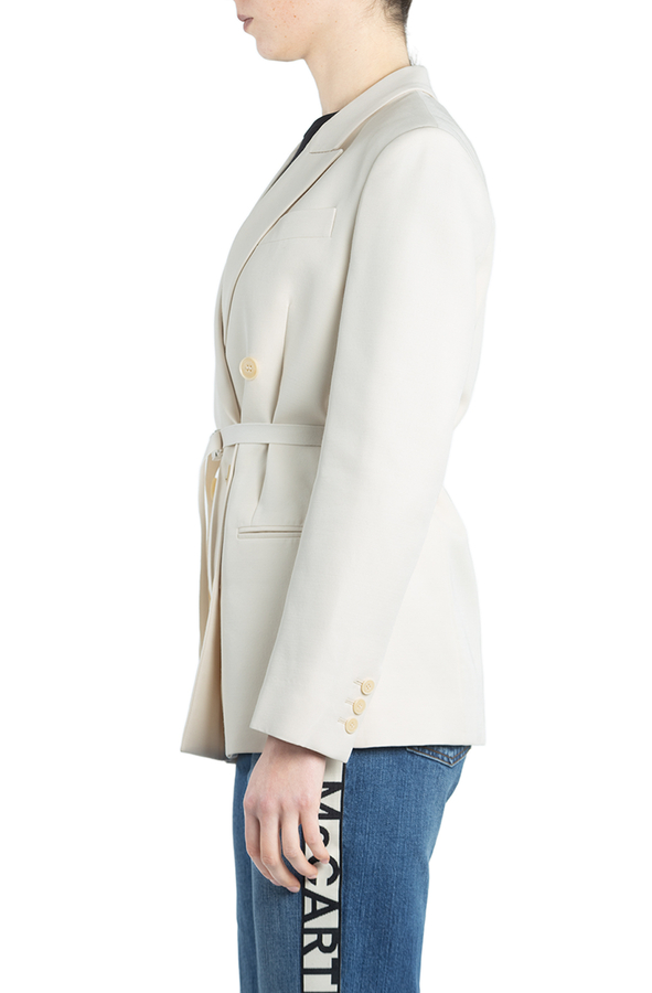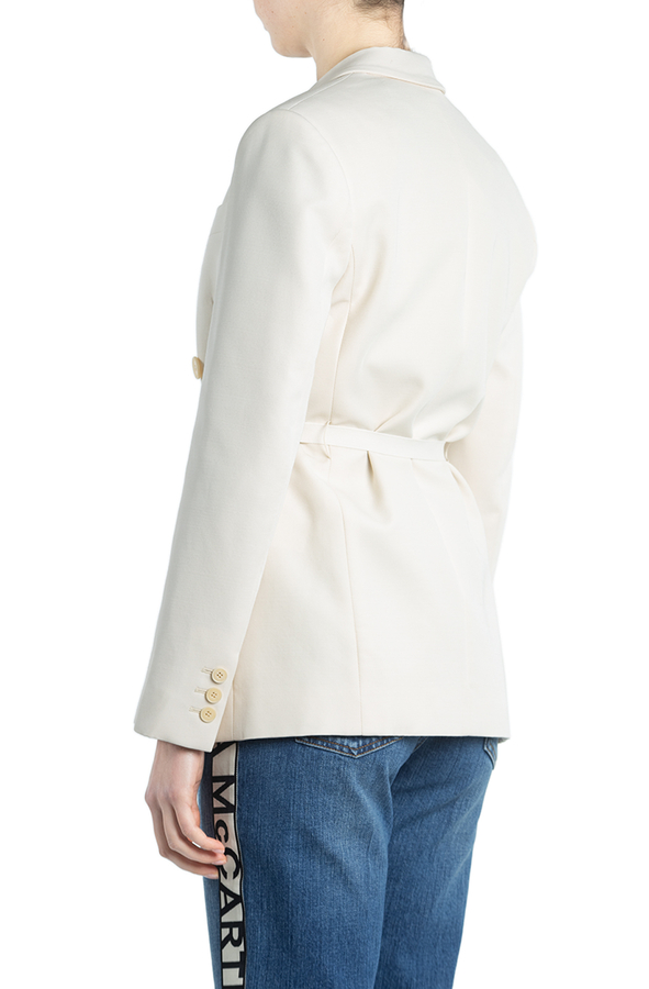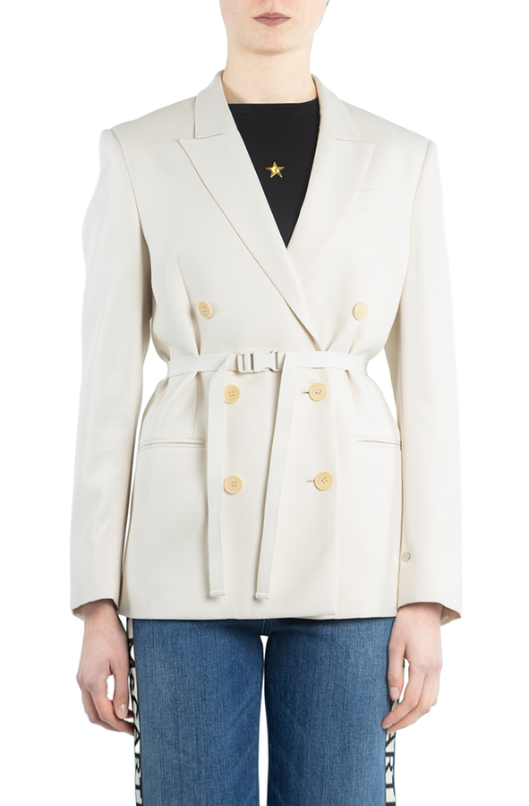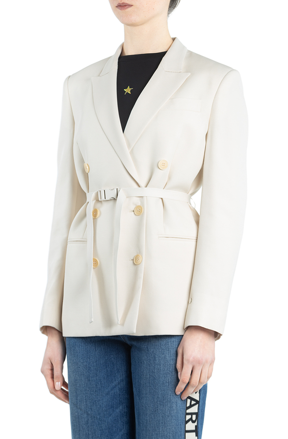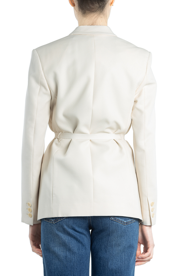 - Блейзер з поясом з загостреними лацканами, застібка на ґудзиках попереду, довгі рукава, прорізна кишеня на грудях, два передніх кишені і ремінь на талії.