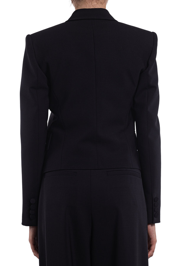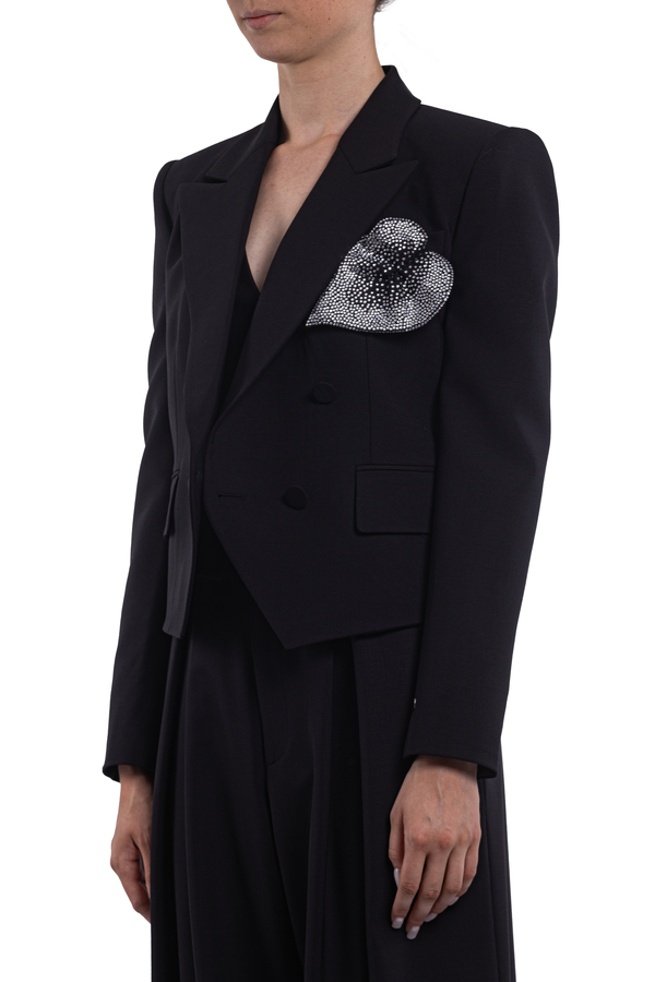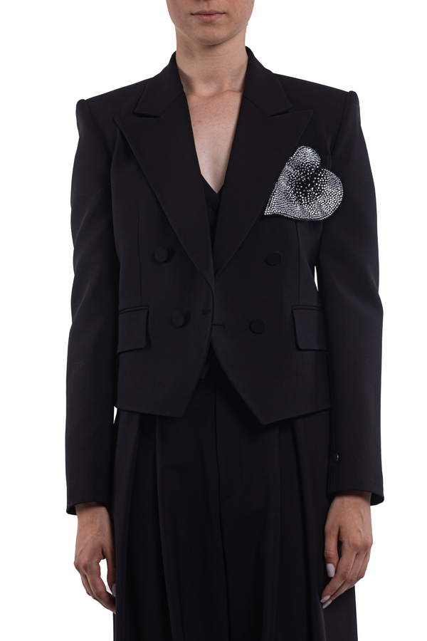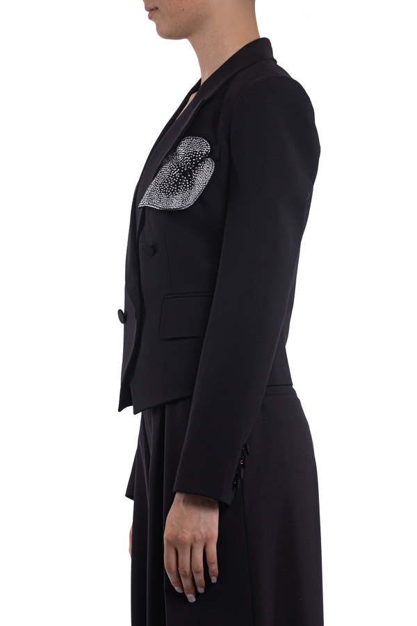 - Двобортний жакет з довгими рукавами, застібка на гудзики, аплікація зі стразами спереду, нагрудна прорізна кишеня, дві передні кишені з клапаном, внутрішня накладна кишеня, повна підкладка