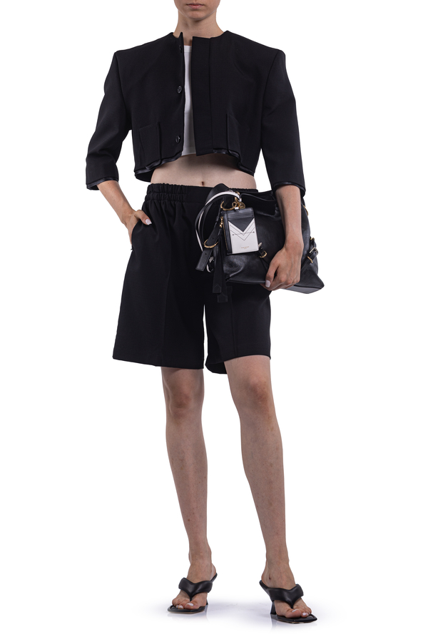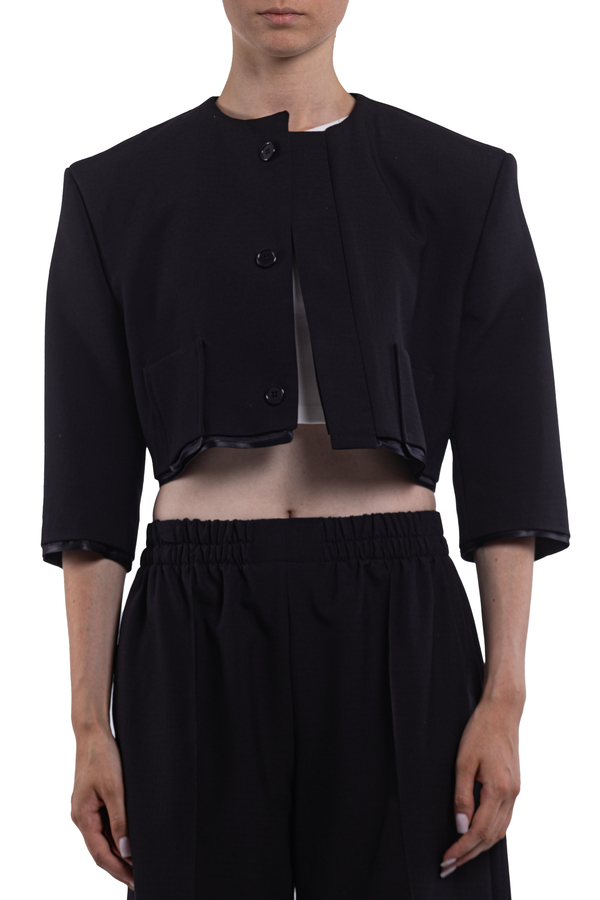 - Укорочений жакет, кругле горло, поділ та рукава обшиті тасьмою, застібка на гудзики, спереду дві накладні кишені, укорочені рукава