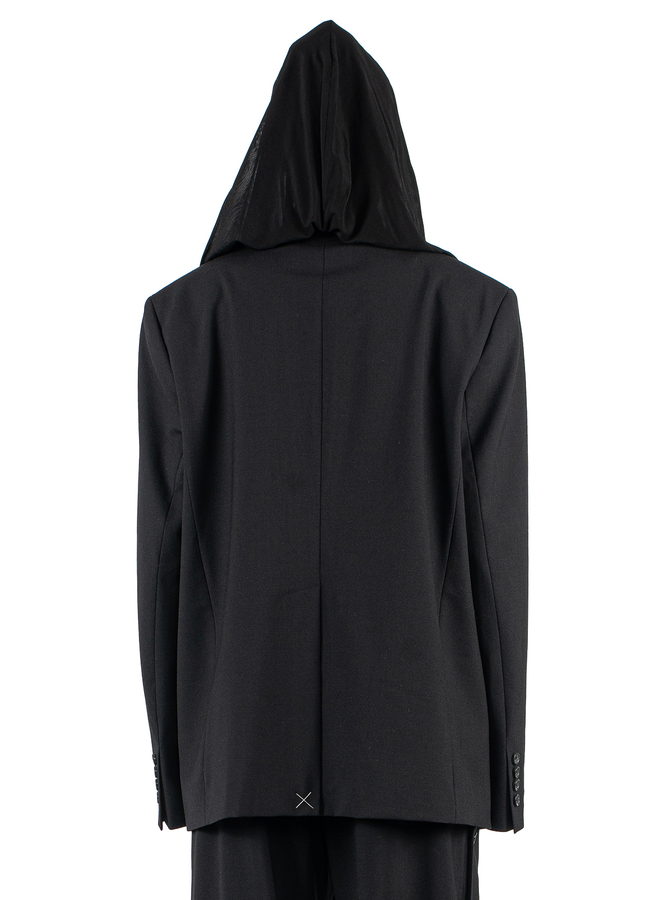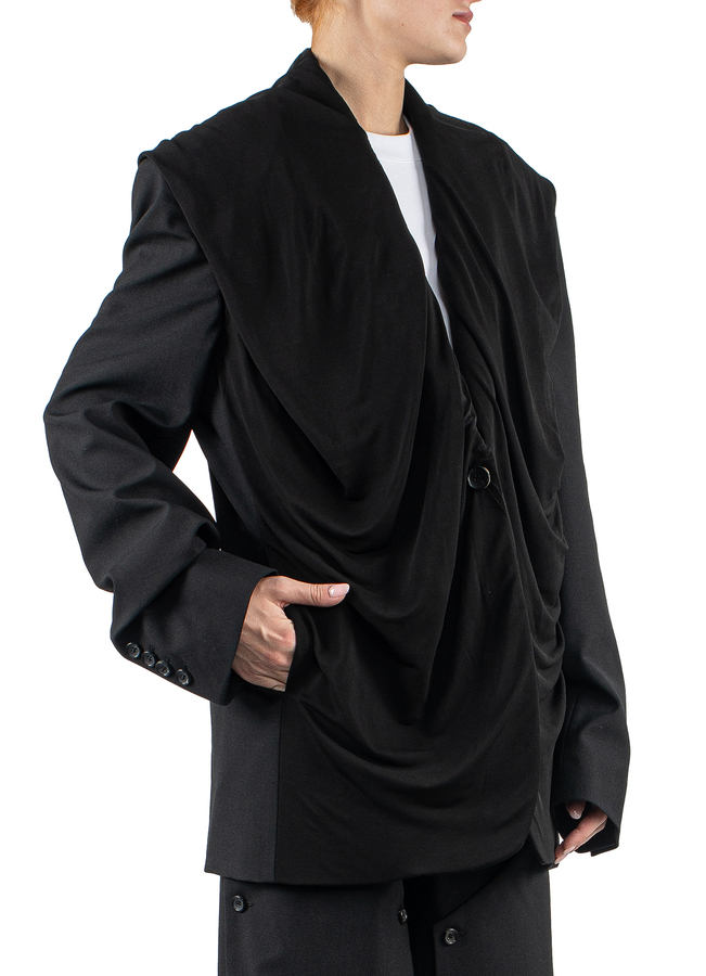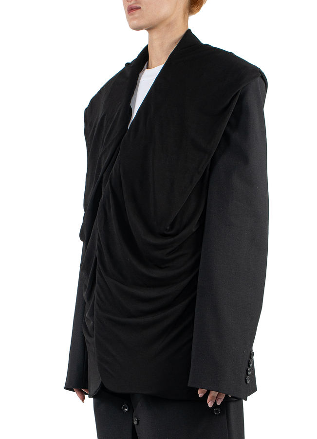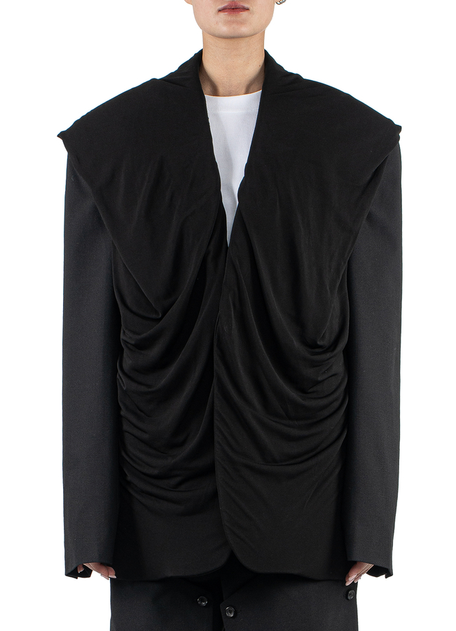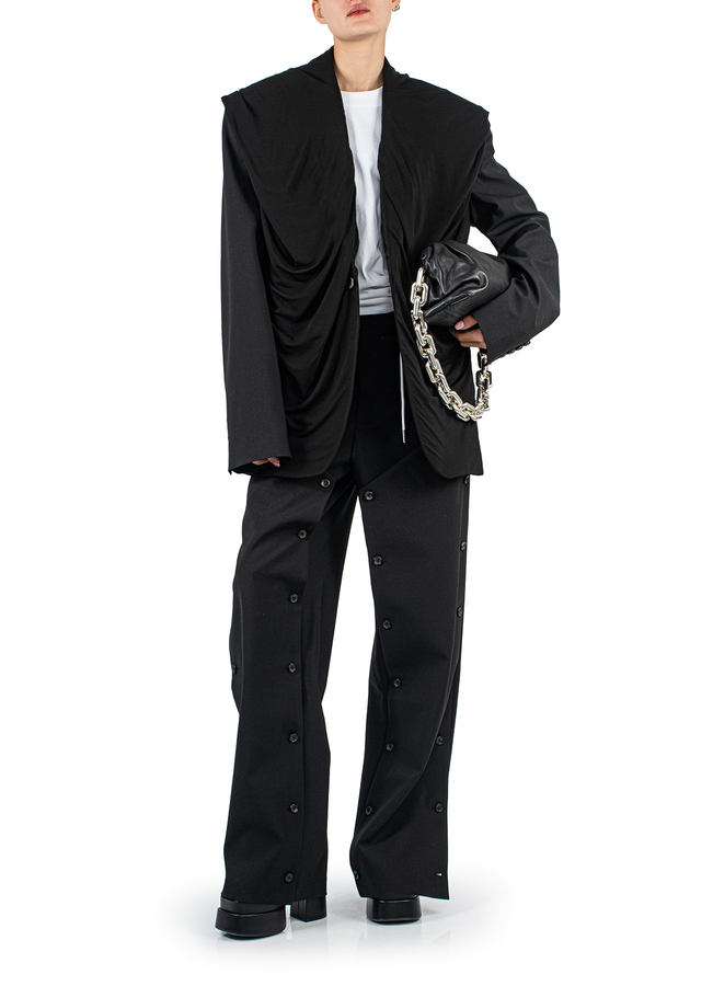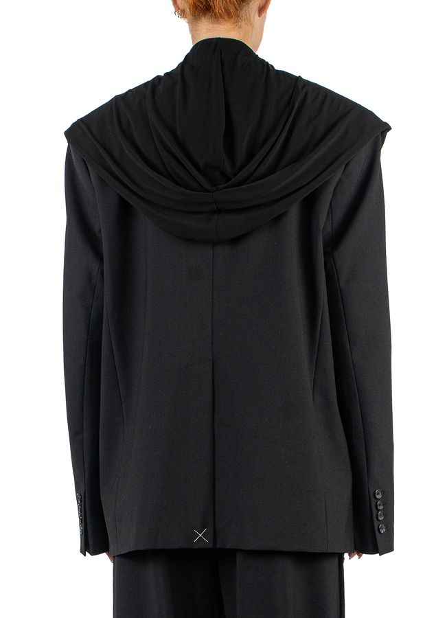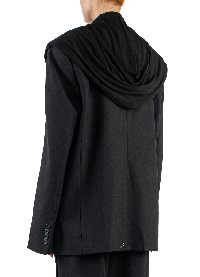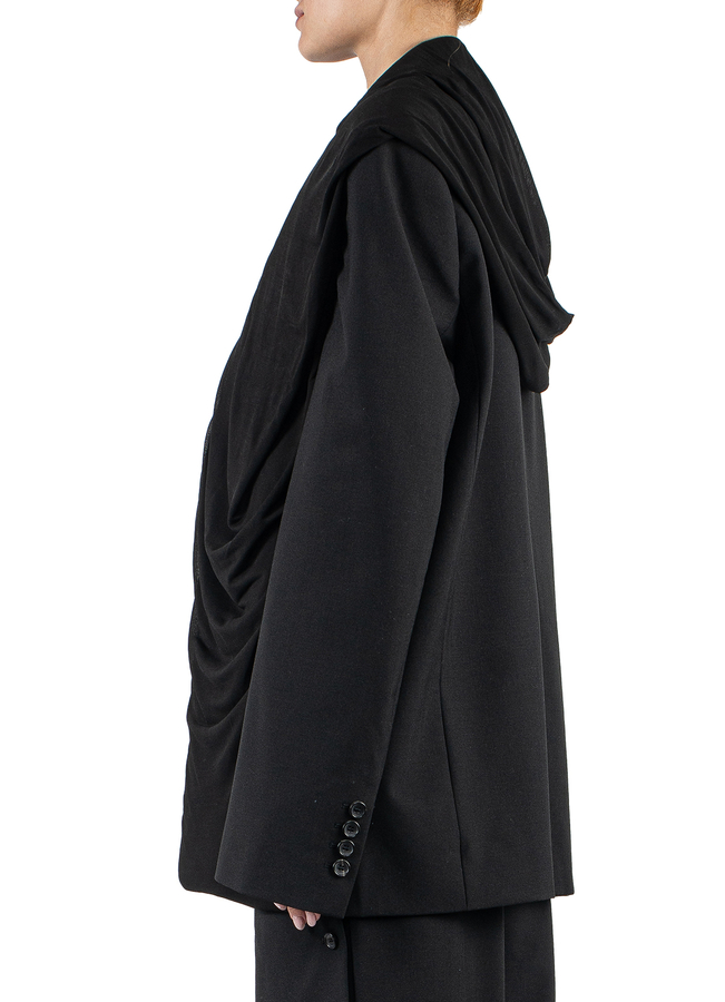 - Жакет з капюшоном та драпіруванням, V-подібний виріз, застібка на гудзики спереду, бічні накладні кишені, шлиця позаду, манжети на ґудзиках