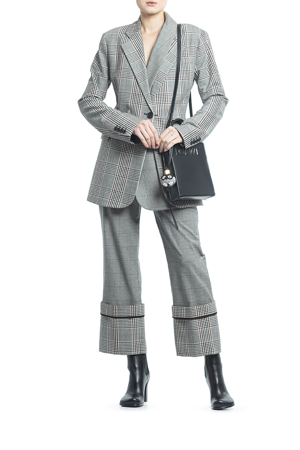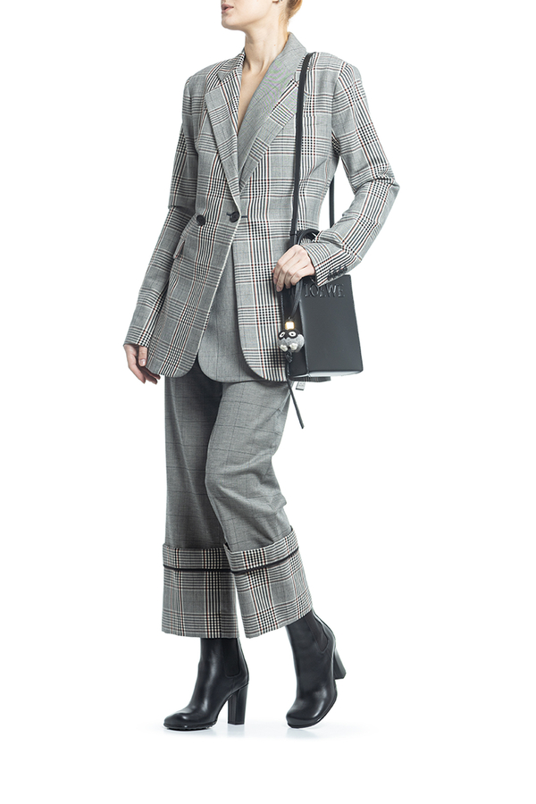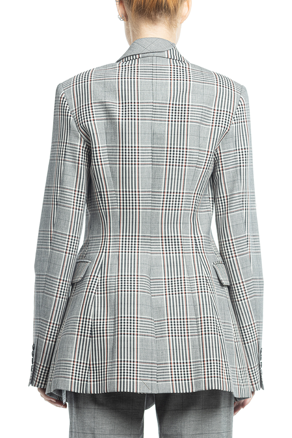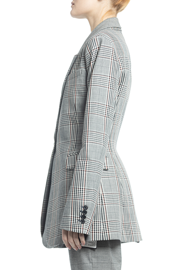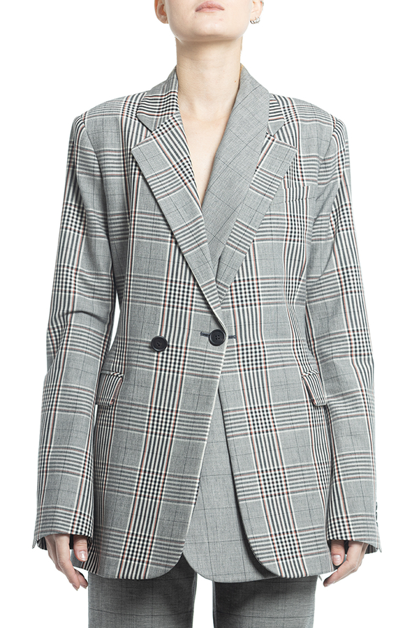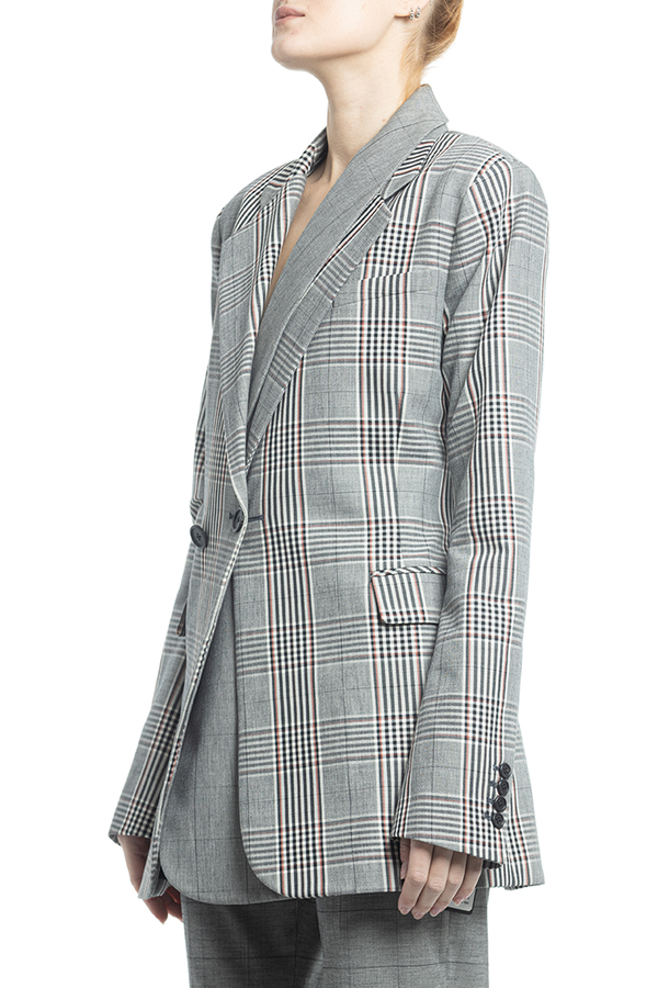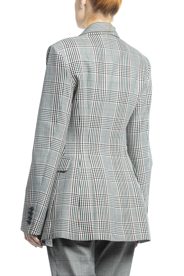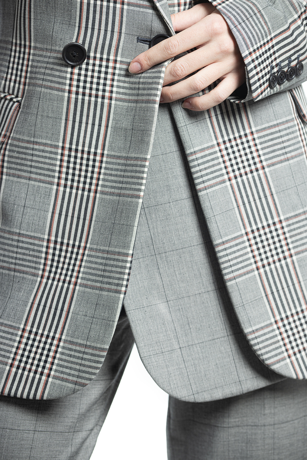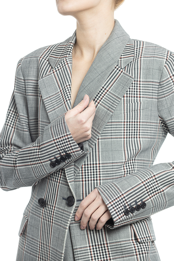 - Двубортний піджак в клітинку з суміши вовни і бавовни. Багатошаровий дизайн, двобортна застібка на гудзики та рукави з манжетами на ґудзиках.