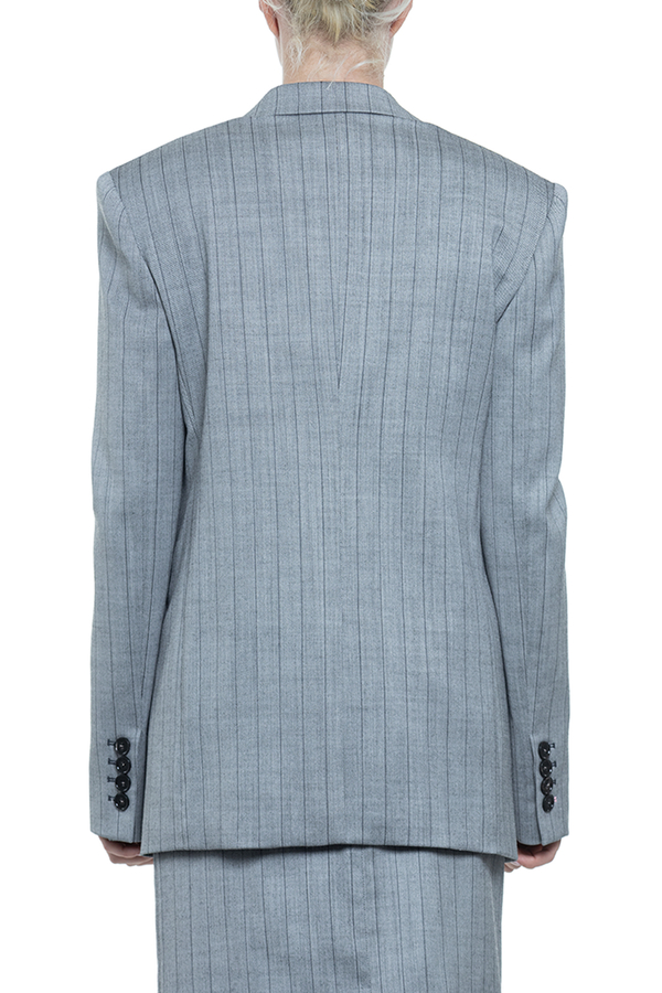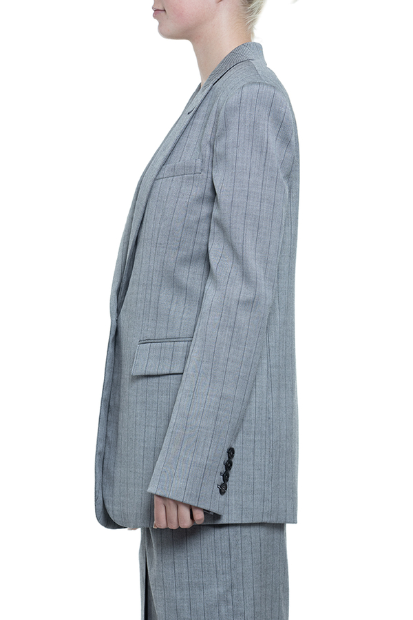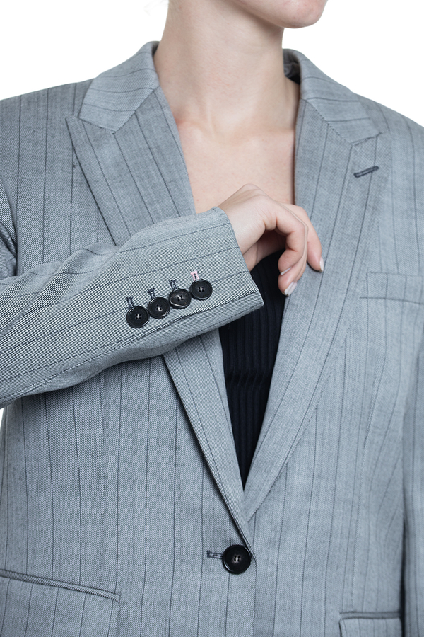 - Смугастий жакет з довгими рукавами, комір з лацканами, підкладка, застібка на гудзик, спереду одна нагрудна накладна кишеня та дві накладні кишені з клапанами