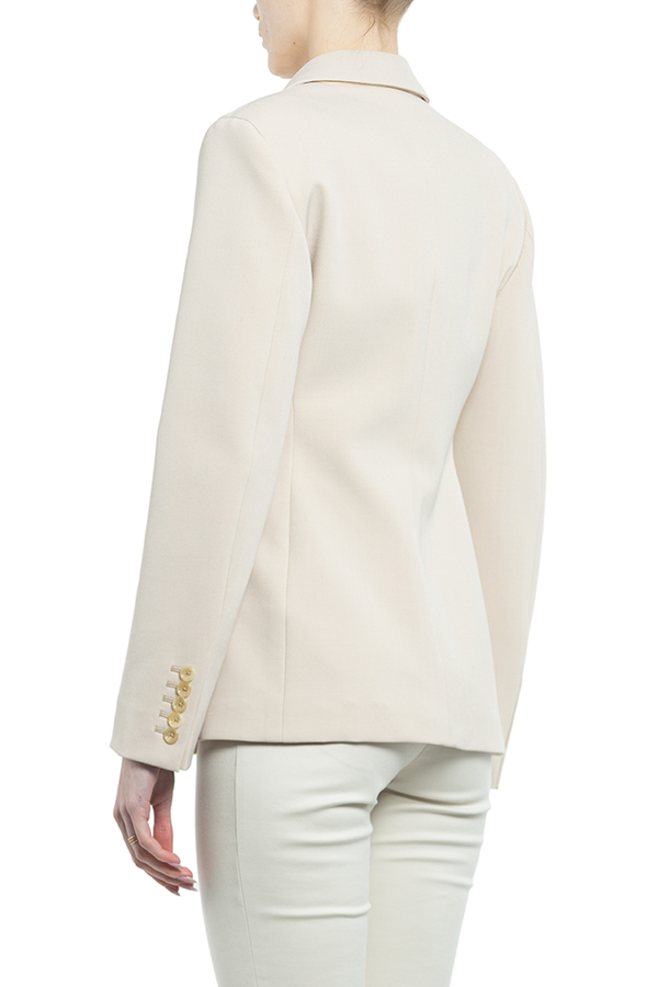 - Жакет двубортний з довгими рукавами і застібкою на гудзики.