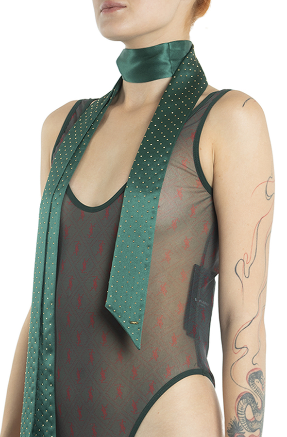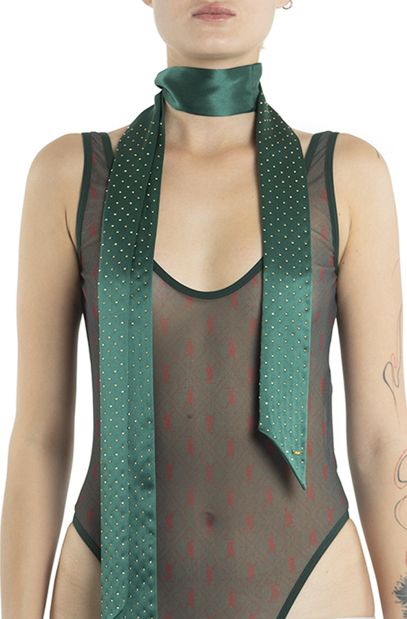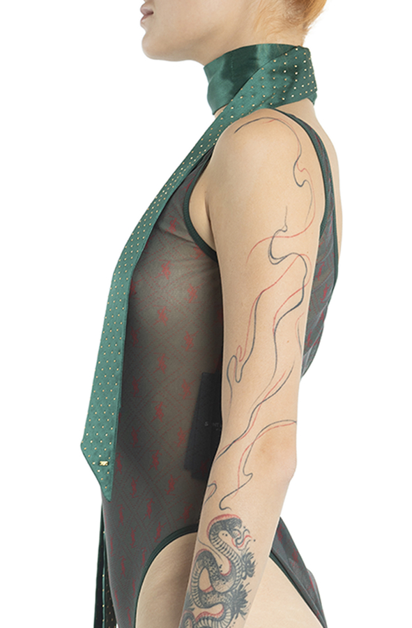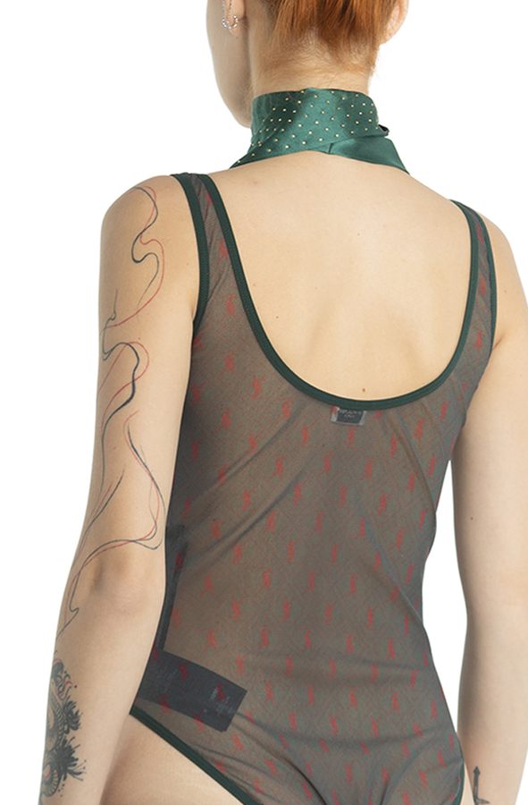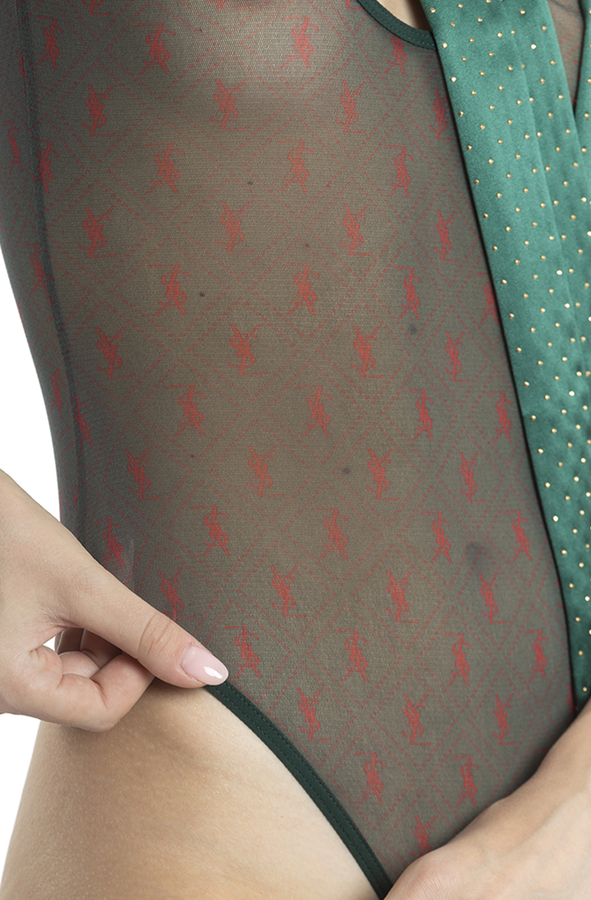 - Боді з патерном з червиних логотипів. Напівпрозора тканина.