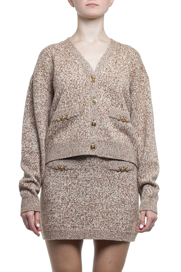- Кардиган вільного крою з довгими рукавами, V-подібний виріз, ребристе оздоблення, хибні кишені з прорізом спереду, застібка на фірмові гудзики Medusa