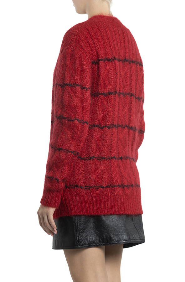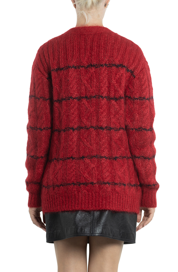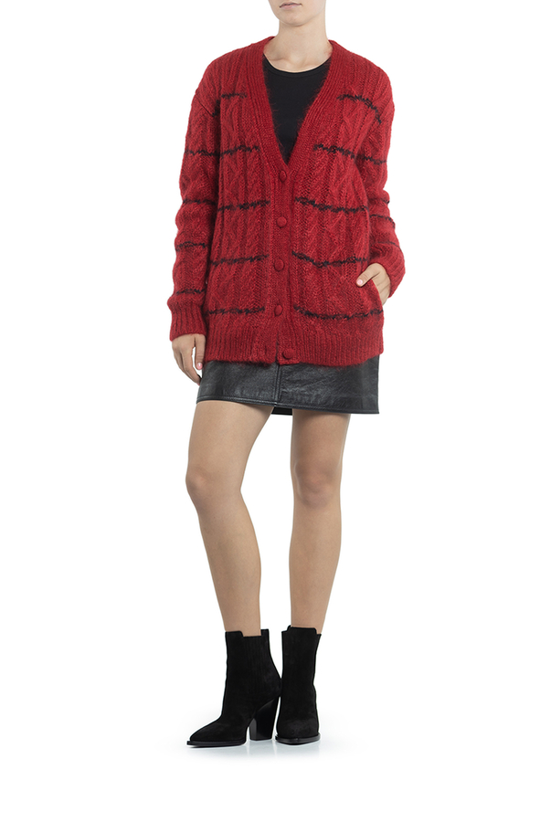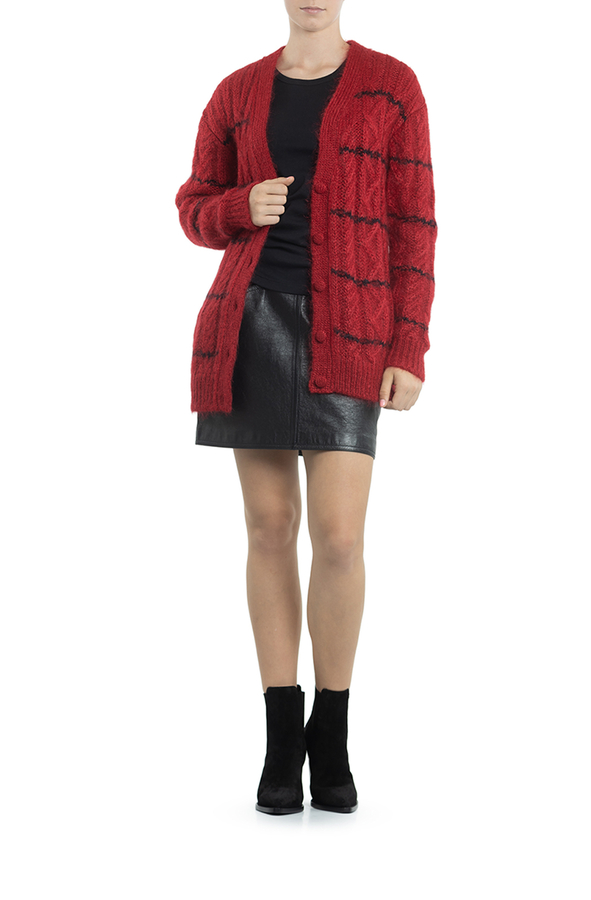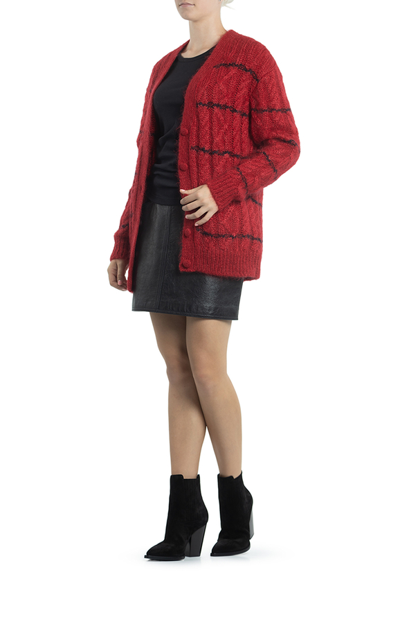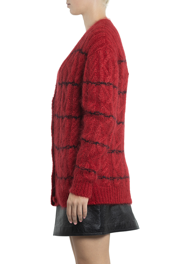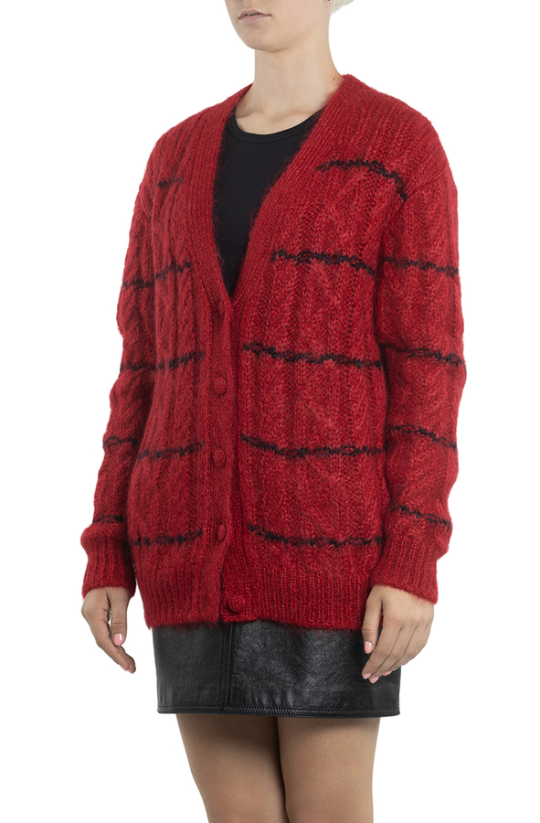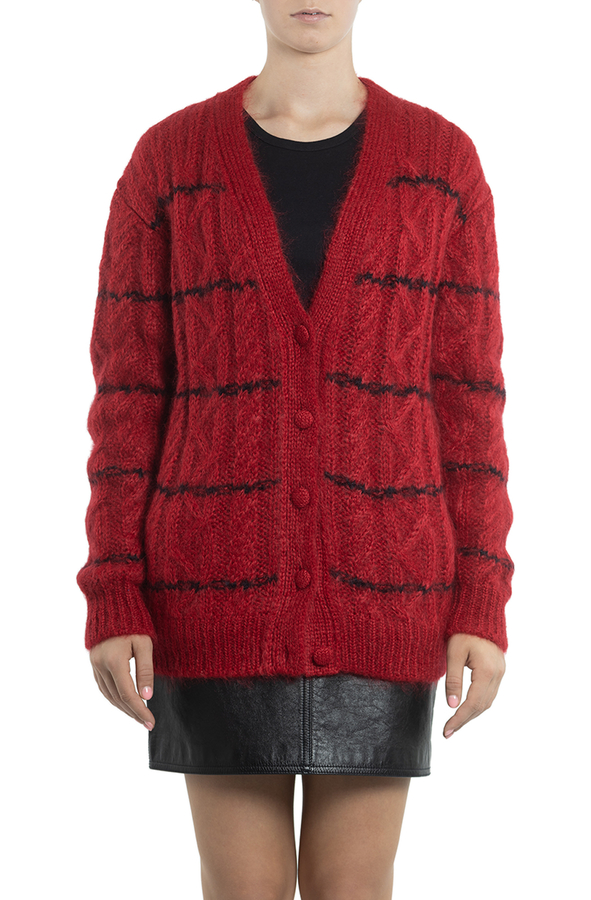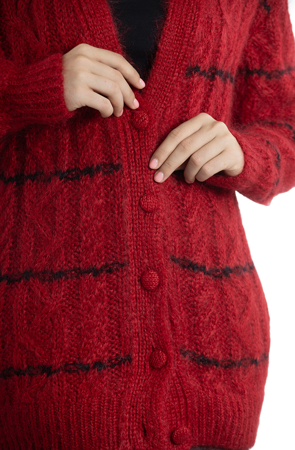 - Кофта на гудзиках з суміши мохеру і шовку. Візерунок у горизонтальну смужку, крупна фактурна в'язка, застібка на ґудзиках спереду, довгі рукави та V-подібний виріз.