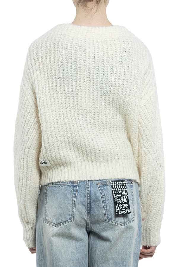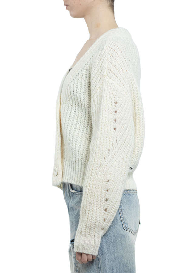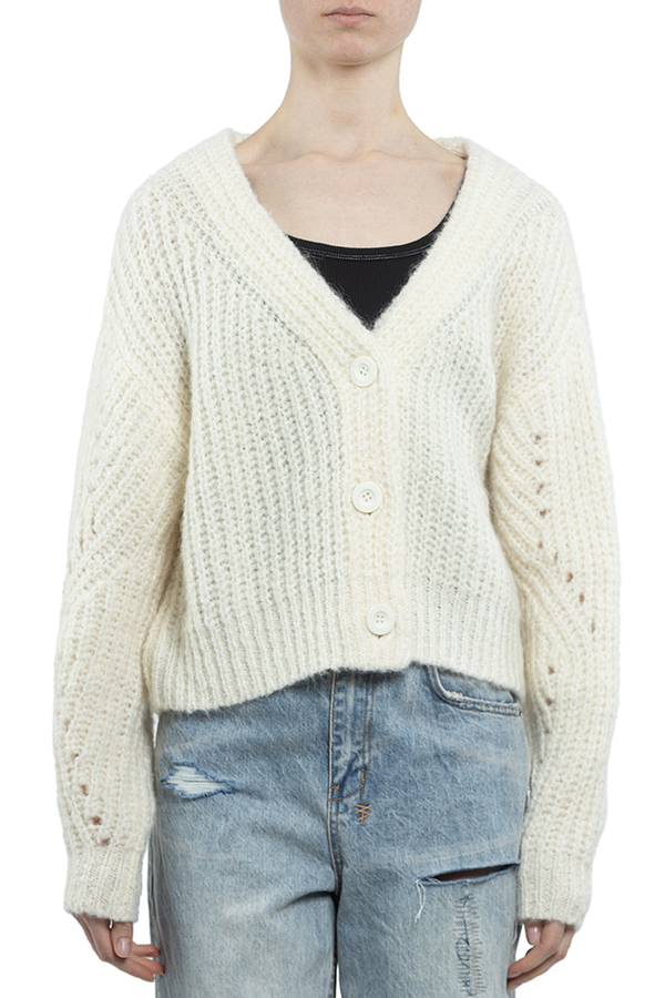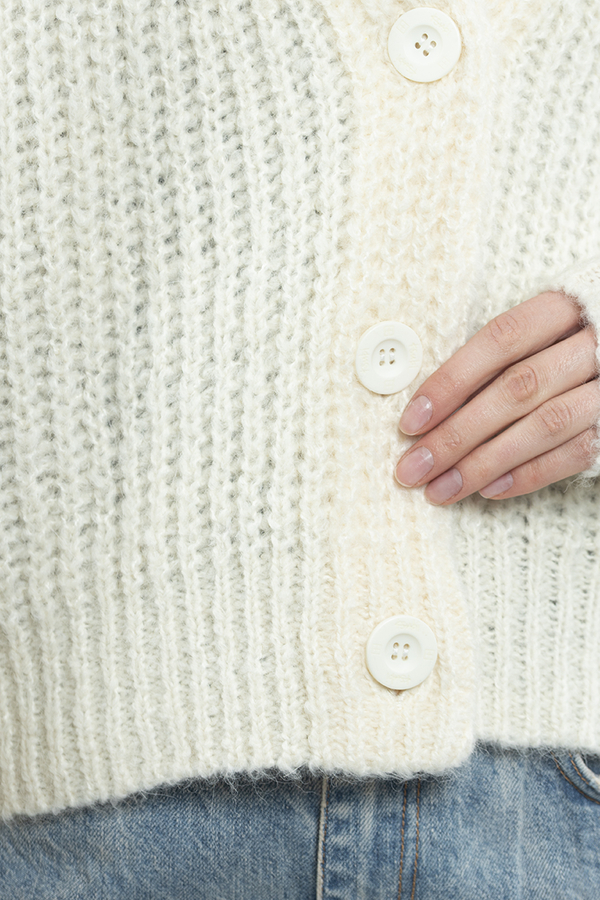 - Фантазійний кардиган розслабленої посадки, з v-подібним вирізом, опущеним плечем і об'ємними рукавами. Виготовлена з високоякісної пряжі з альпаки та вовни.