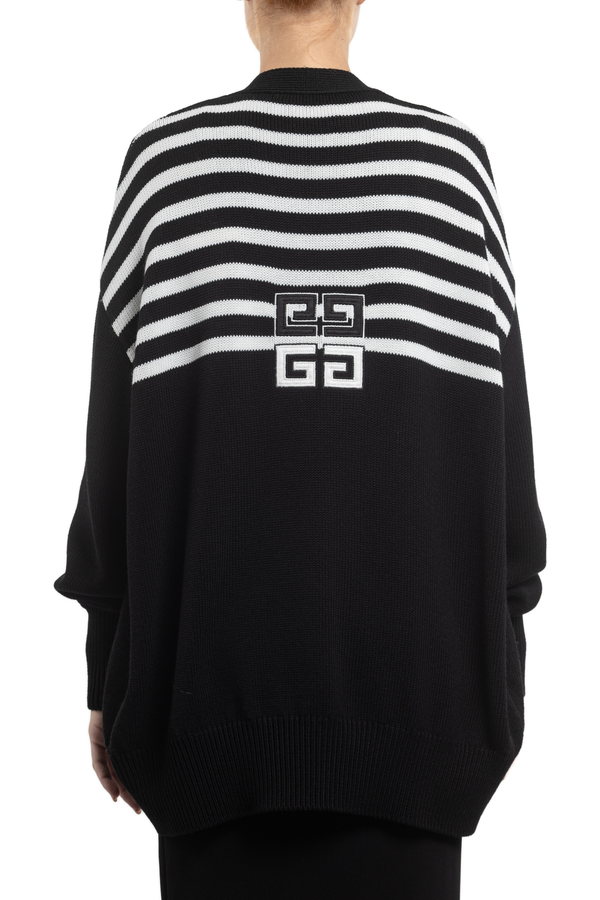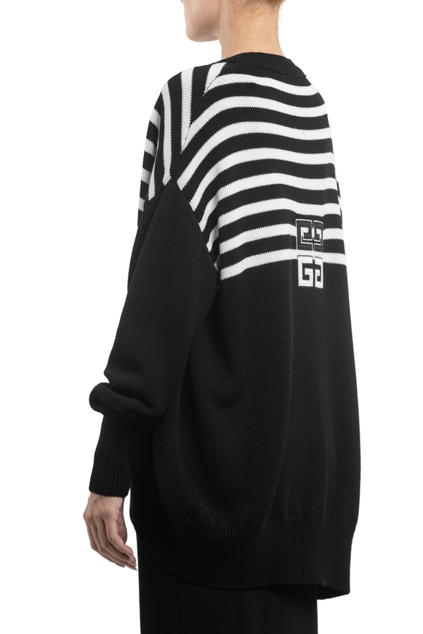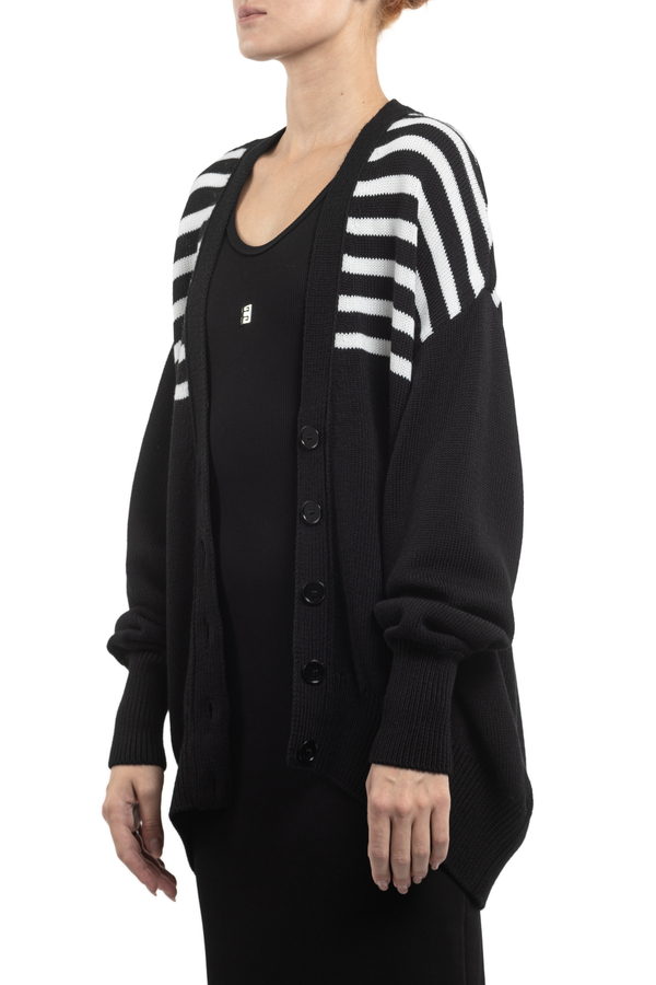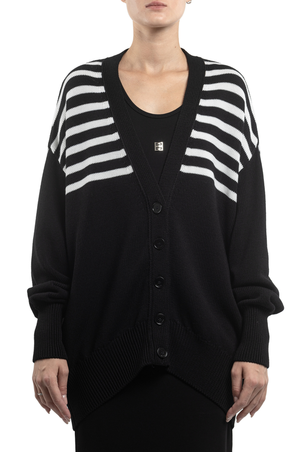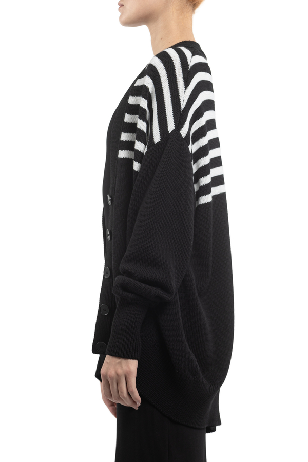 - Смугаста кофта з довгими рукавами, V-подібний виріз, двоколірна нашивка на спині, застібка на гудзики