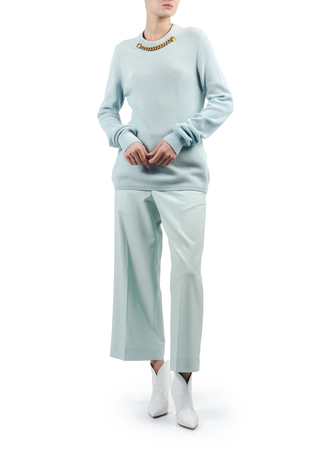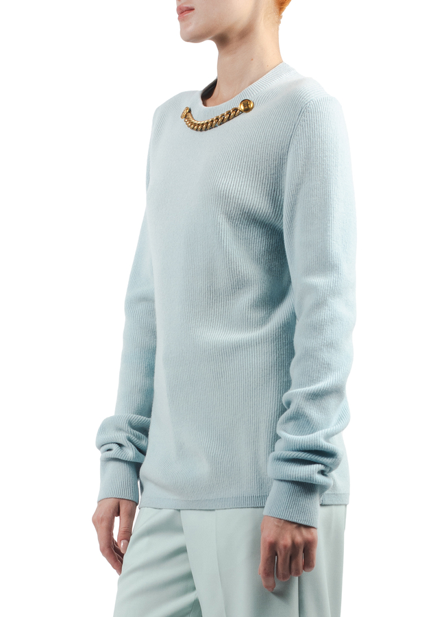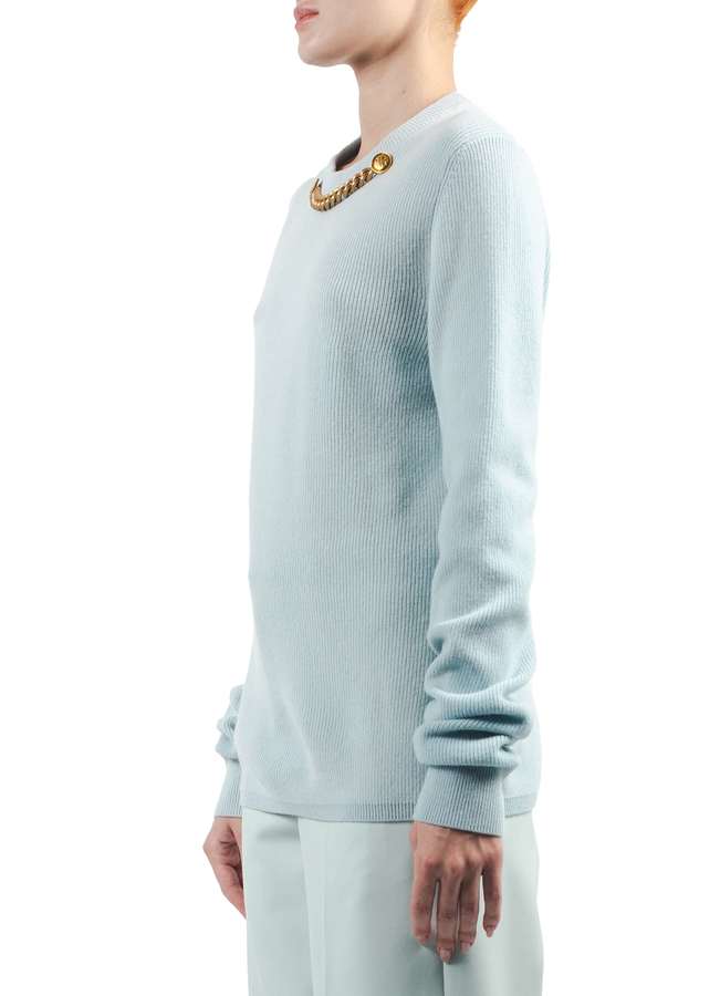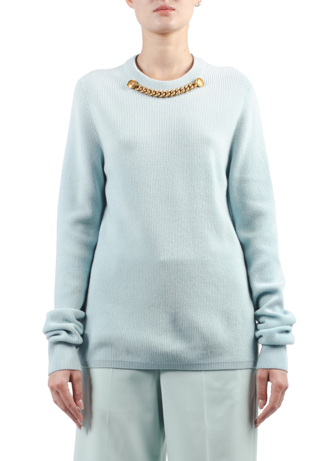- Облягаючий светр з елементом декору - масивним ланцюгом кольору античного золота і гудзиками з емблемами марки