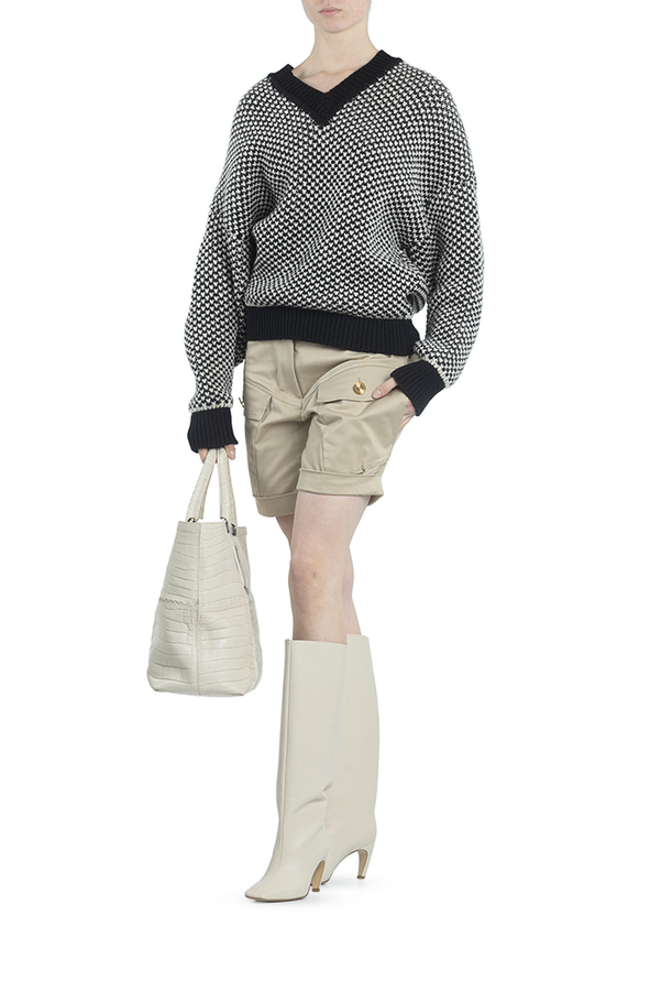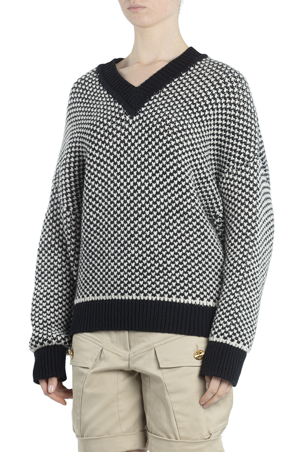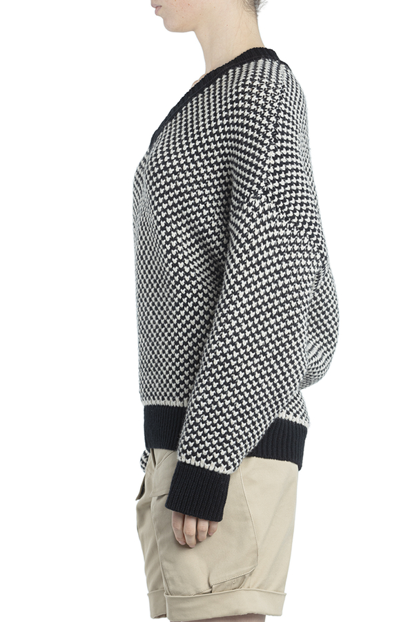 - Светр з довгими рукавами і класичним коміром на гудзиках.