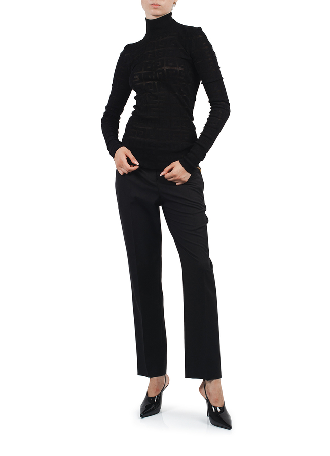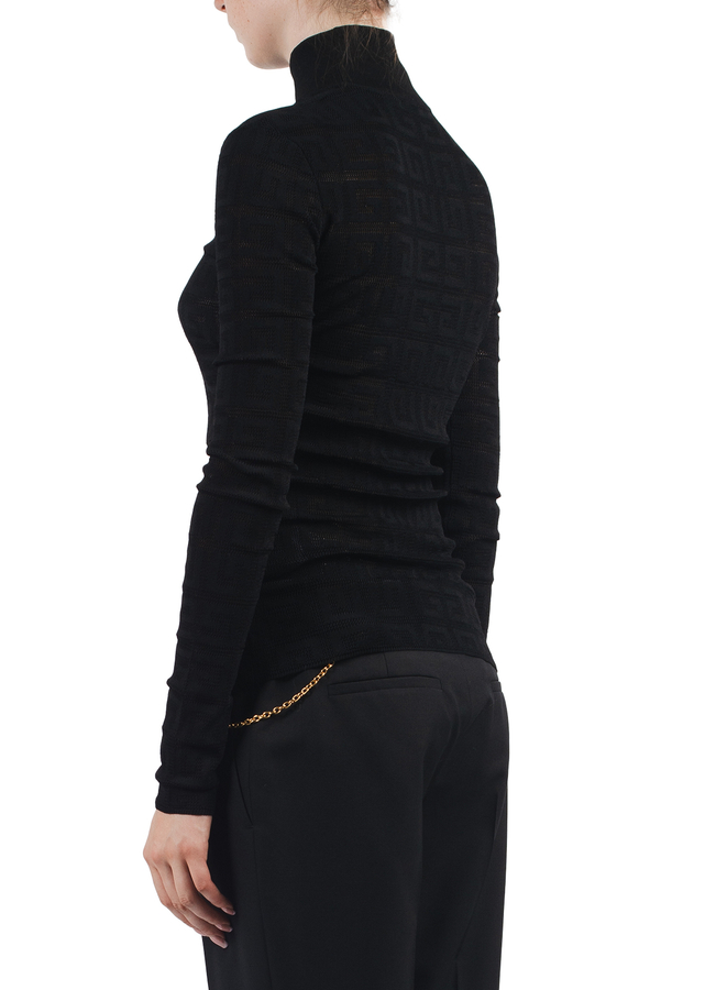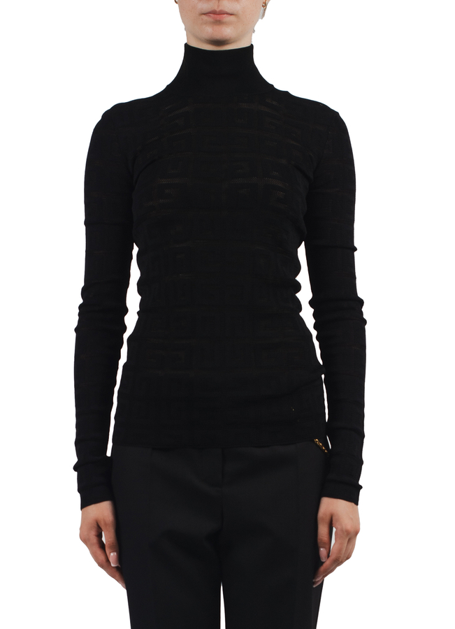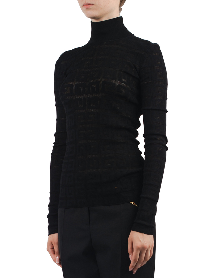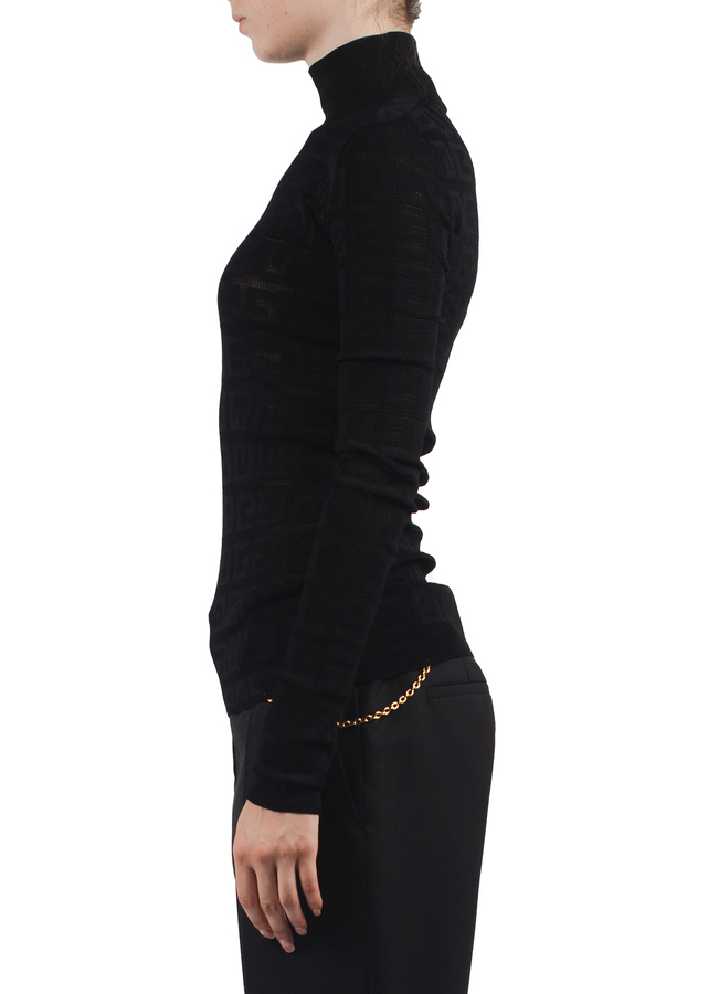 - Трикотажний светр з високим коміром і патерном з логотипів 4G. Літера «G» у геометричному стилі, довгі рукави, прямий поділ.