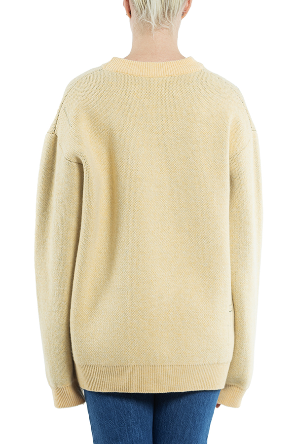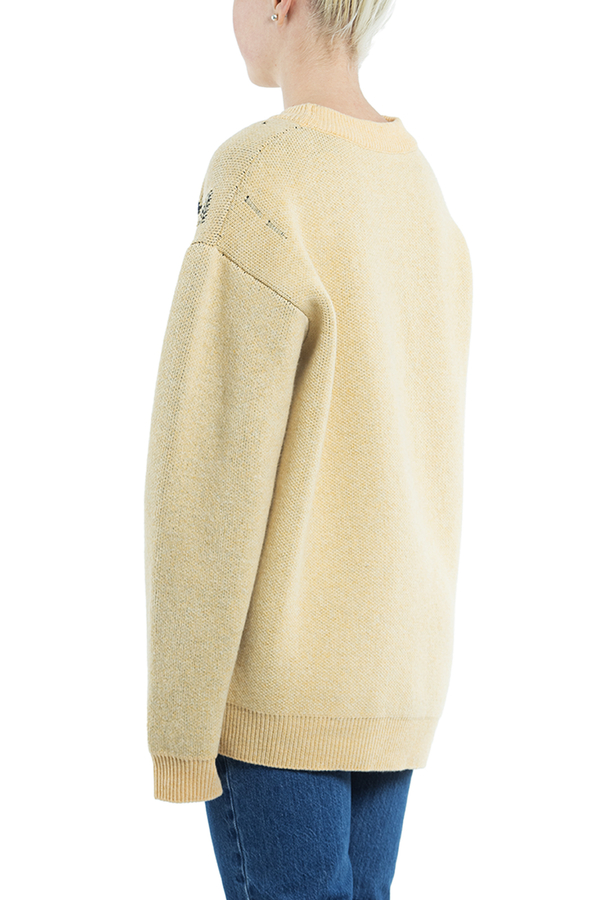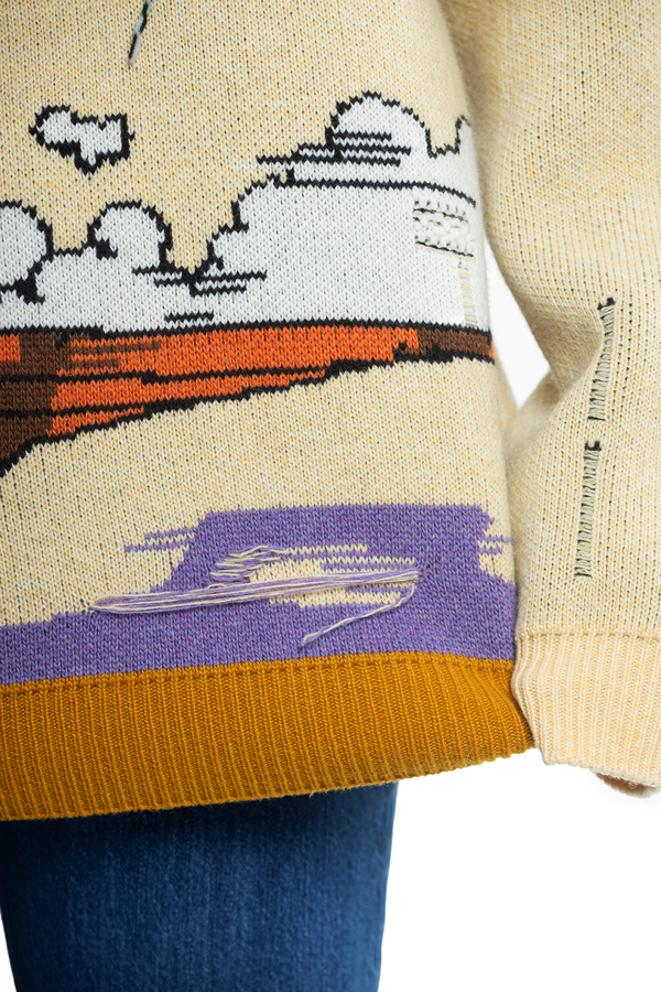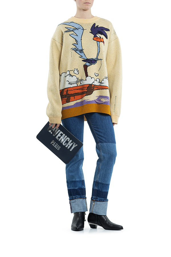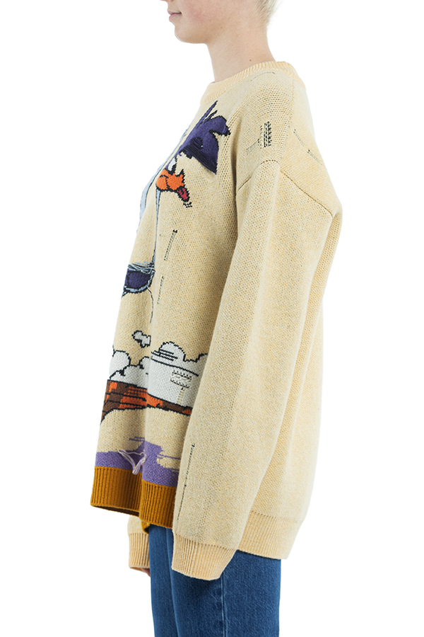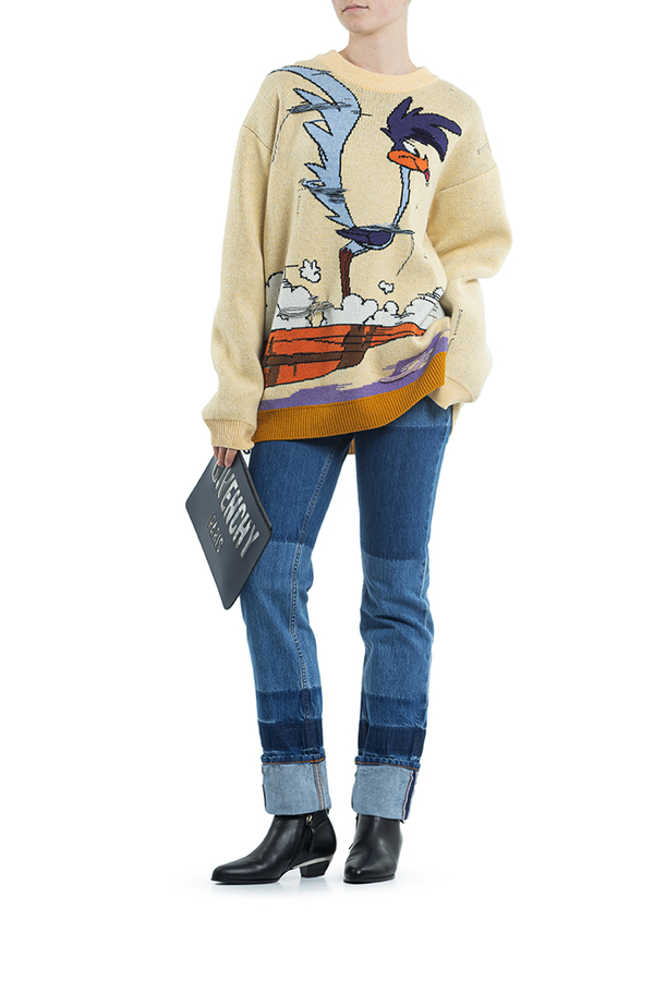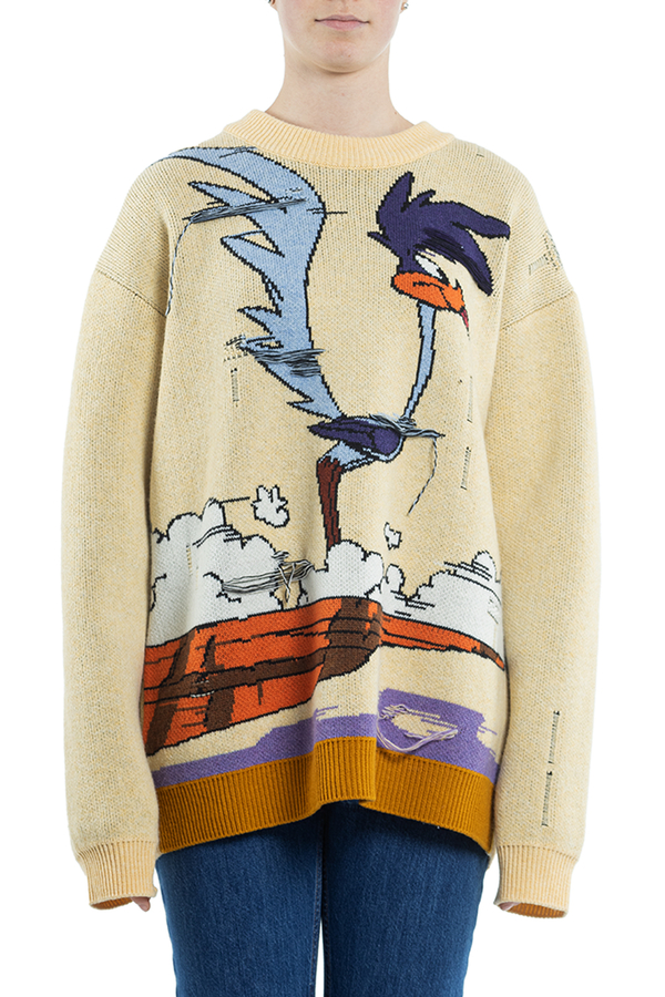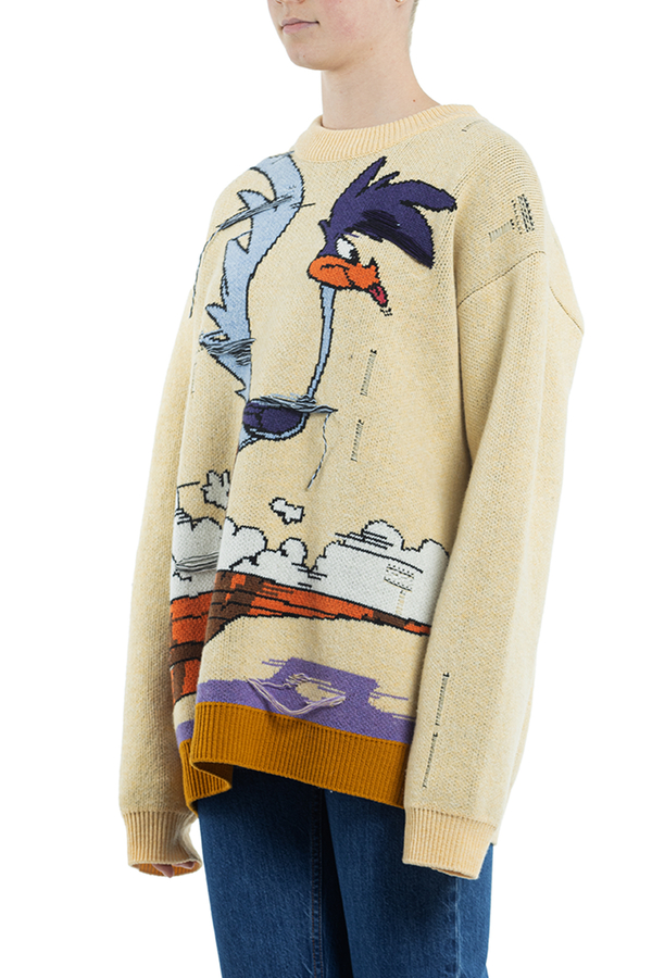 - Пуловер із натуральної вовни. Ребриста шия, манжети та поділ. Спереду зображення з мультфільму Road Runner.