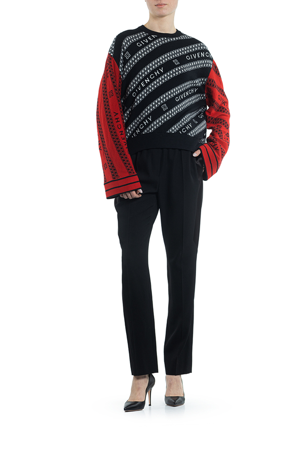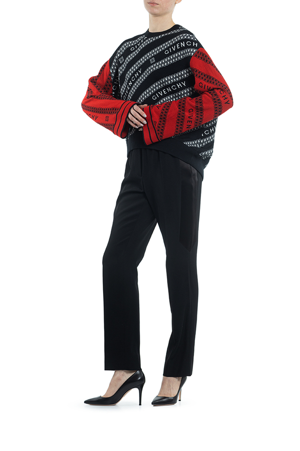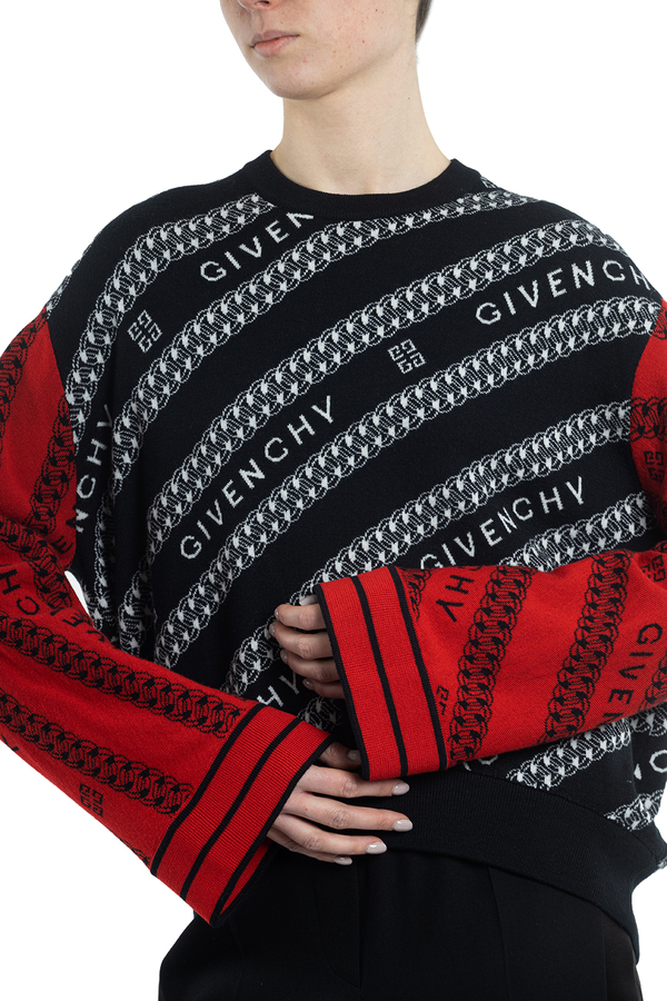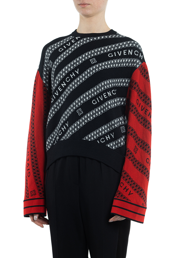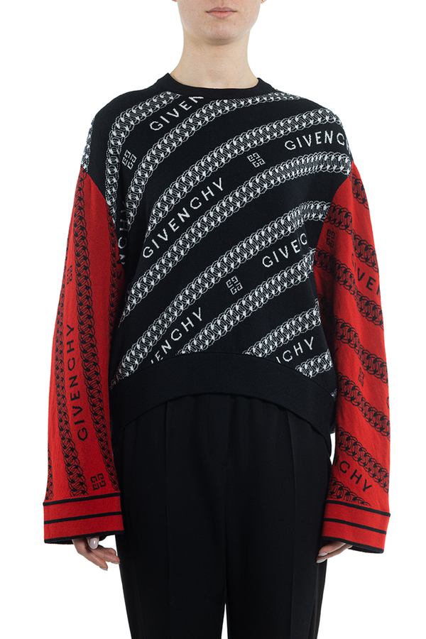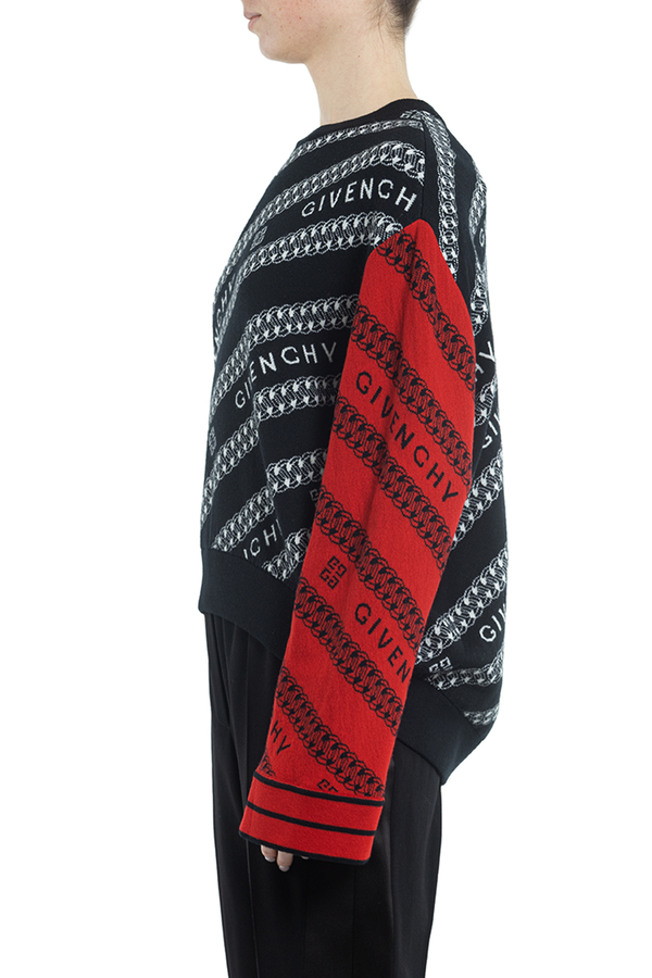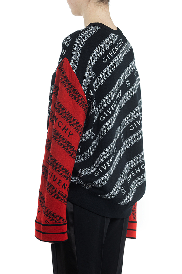- Светр з довгими широкими рукавами іншого коліру. Патерн з ланцюжка і логотипу бренда. Свободний крій, еластичний низ виробу.