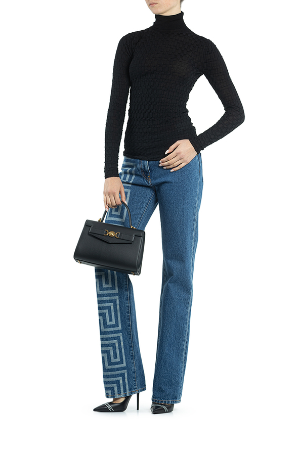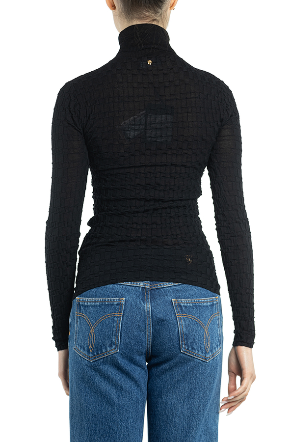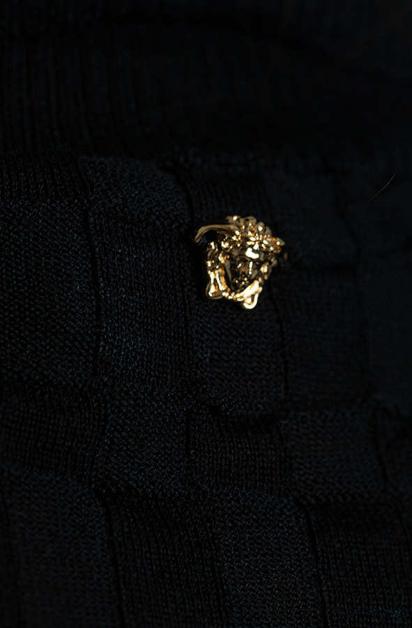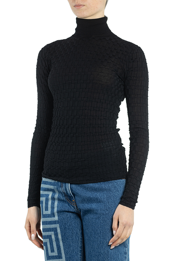 - Джемпер-гольф з високим коміром. Трикотажний матеріал, принт Medusa на спині, високий комір, довгі рукави і прямий поділ.
