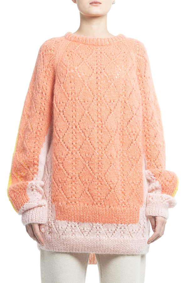 - Светр з мохеру Trompe l'oeil. Светр з круглим вирізом у витонченому мохеровому трикотажі з візерунком ромбами.