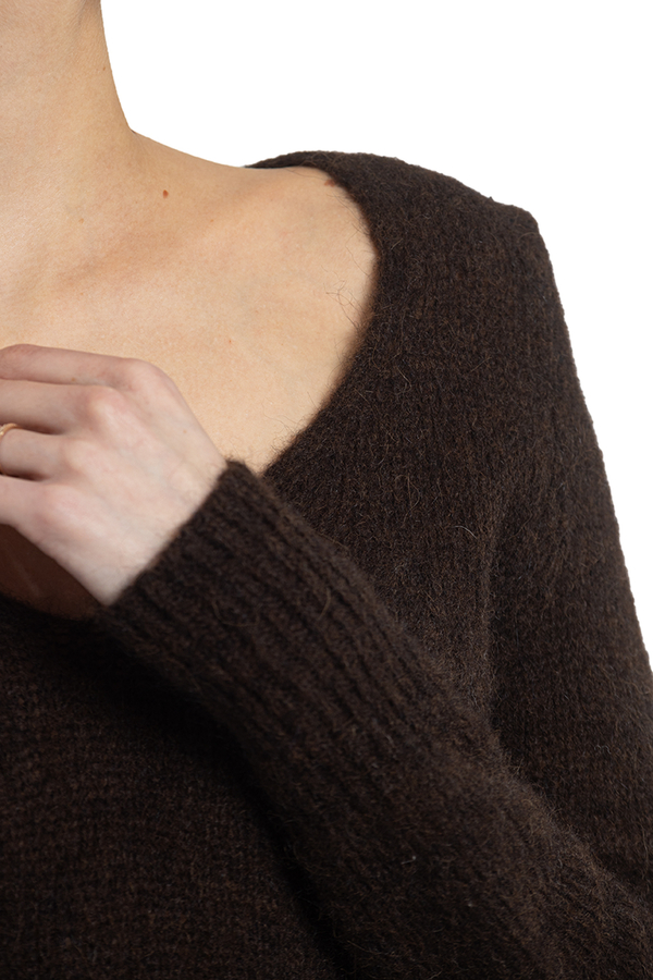 - Тонкий светр з V-подібним вирізом горловини. Короткий, в’язаний з м’якої меланжевої пряжі з суміші альпака. Ребристі манжети та подоли.