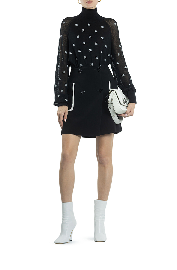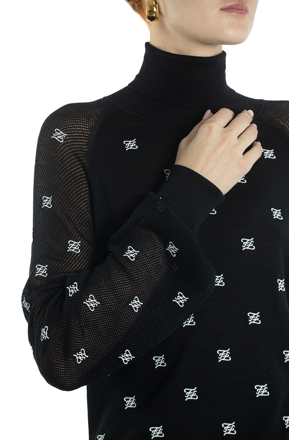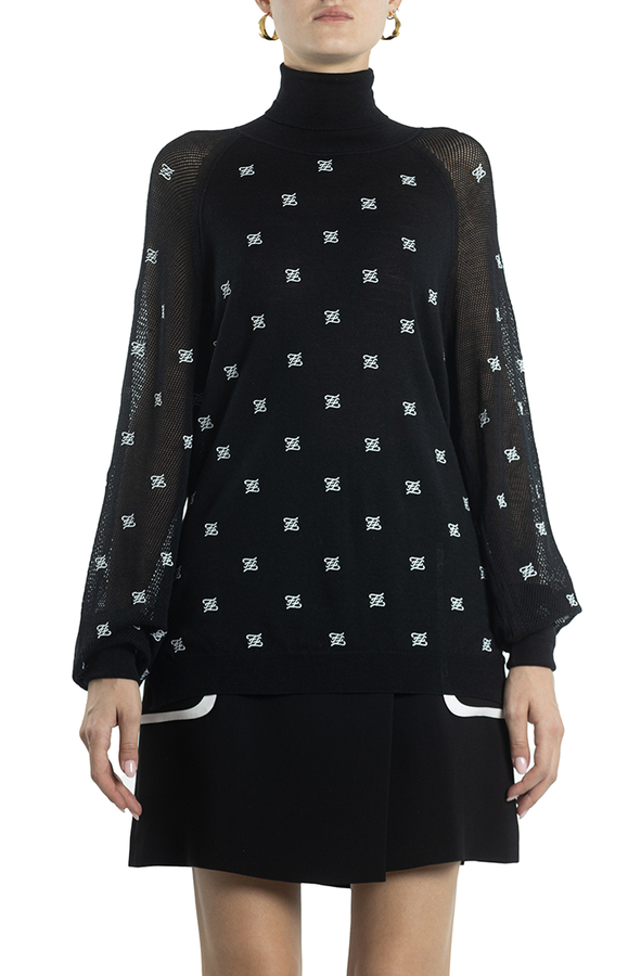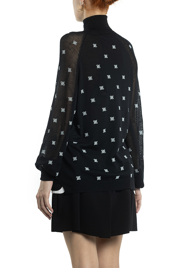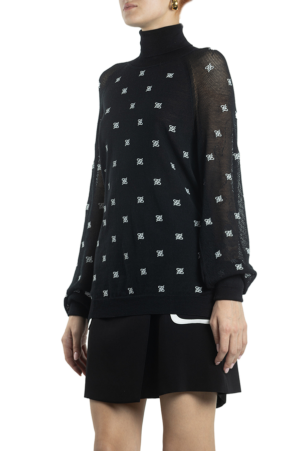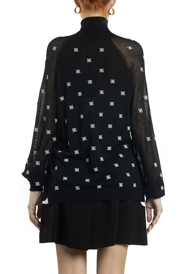 - Тонкий светр з високим горлом і довгими перфорованими напівпрозорими рукавами. Патерн з білих логотипів по всій поверхні.