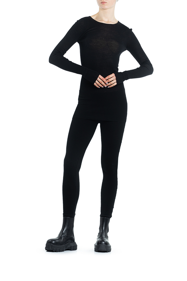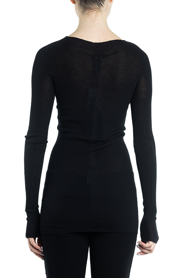 - Светр з тонкої вовни з круглим вирізом горловини. Має довгі рукави і поділ. Тканина в дрібний рубчик.