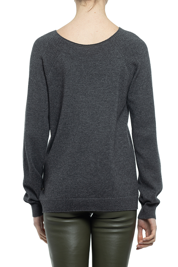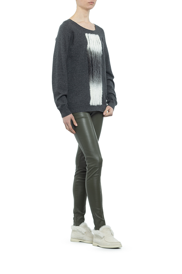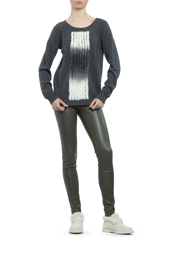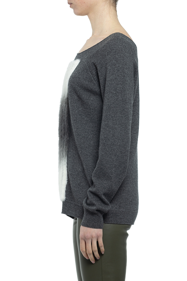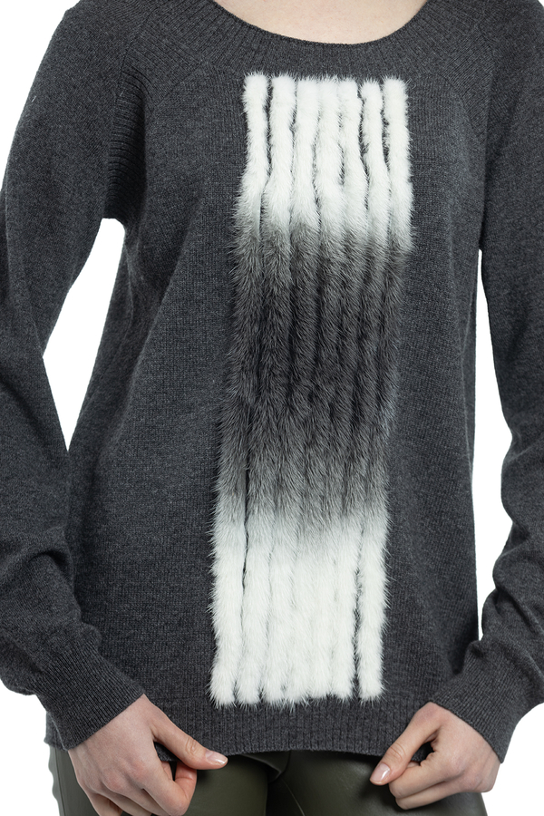 - Светр з суміши кашеміру і мериносової вовни з вставками з хутра норки попереду. Круглий виріз горловини, довгі рукави.