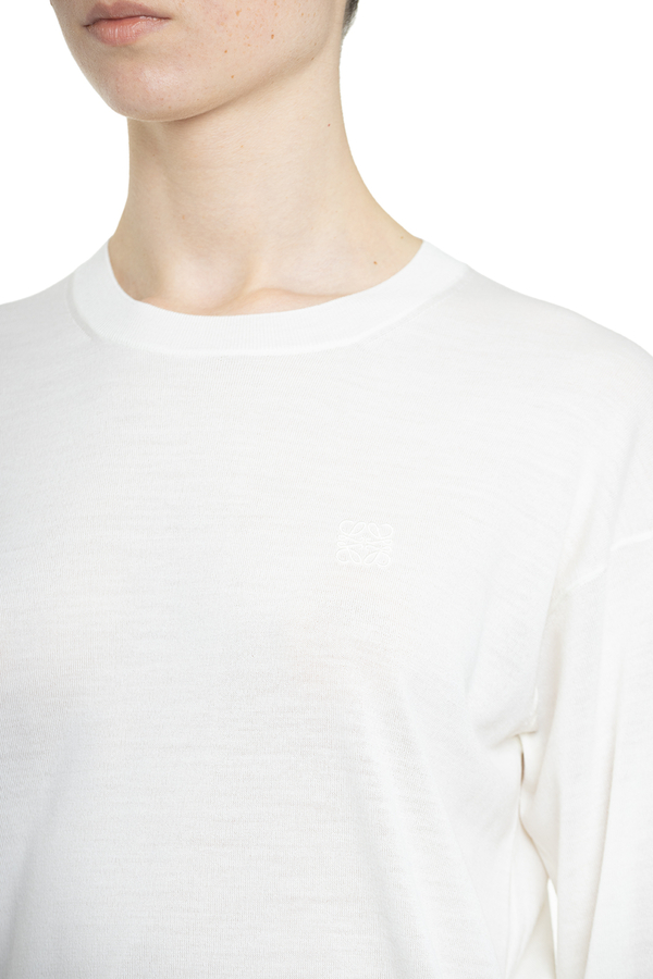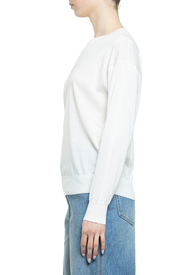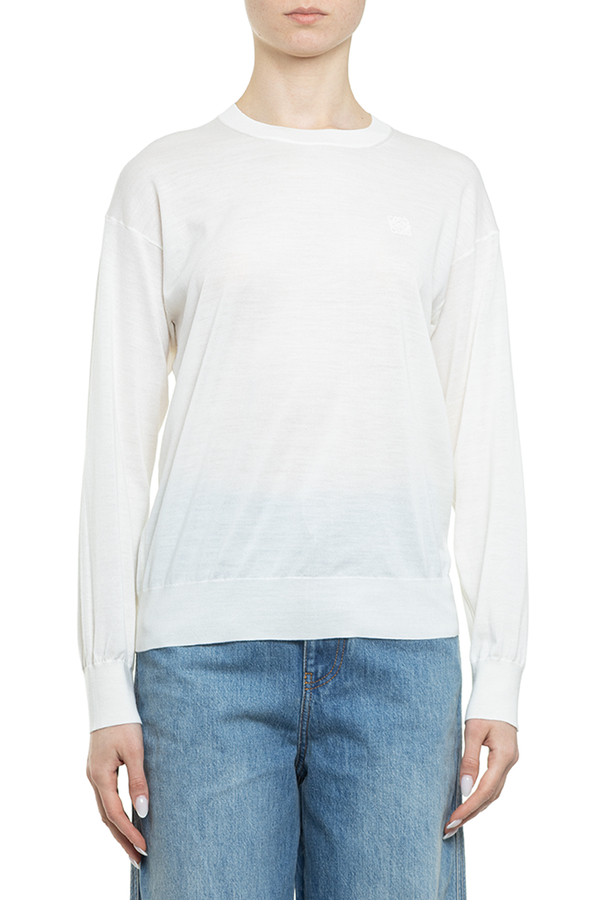 - Светр з довгими рукавами вільного крою, круглий виріз горловини, ребристі манжети та низ, вишивка анаграми на грудях