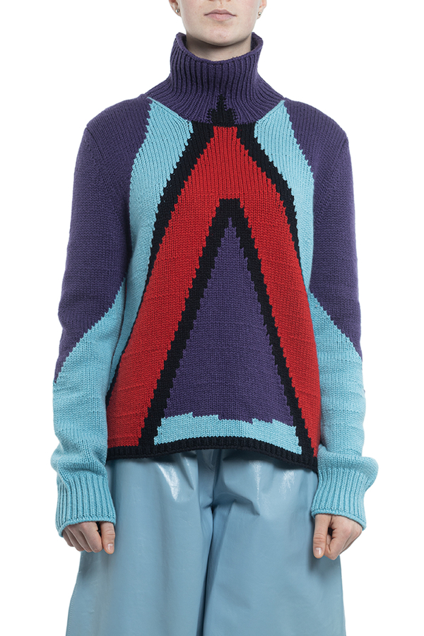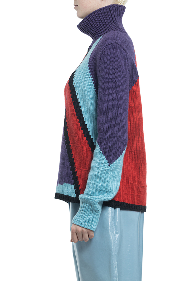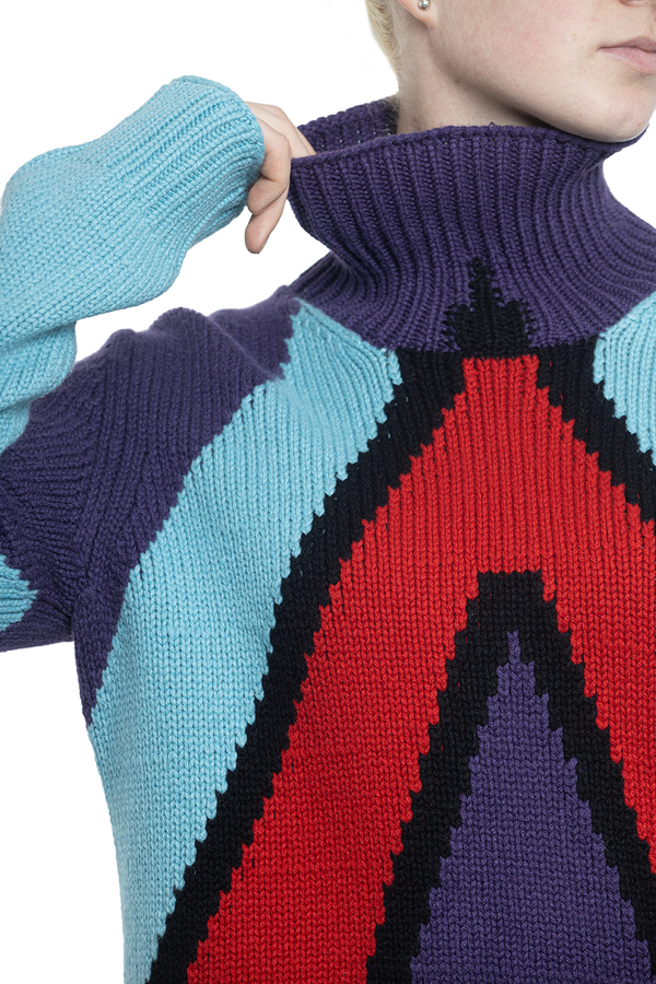- Светр з високим коміром і довгими рукавами. Багатокольоровий геометричний візерунок.