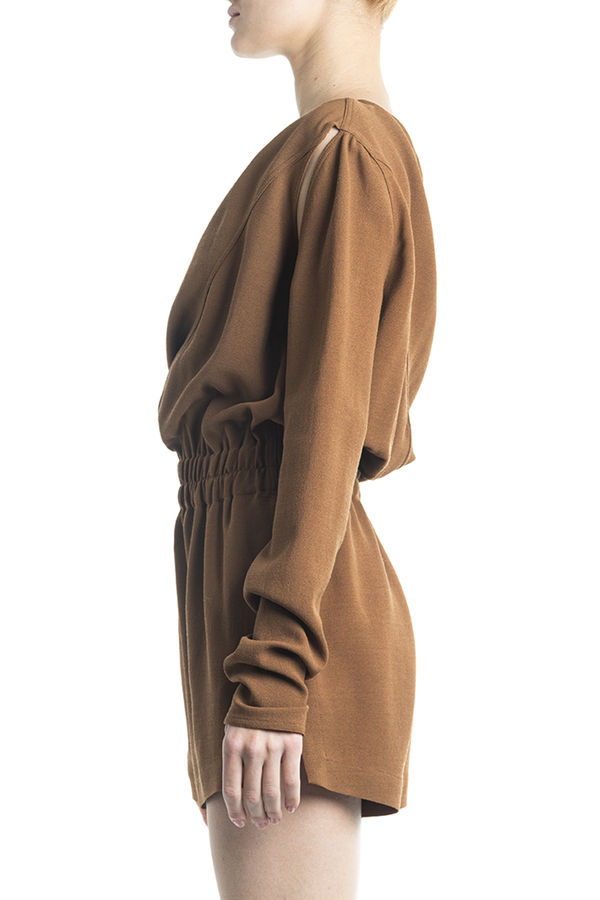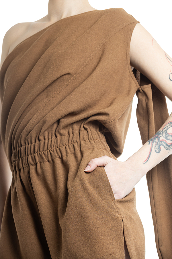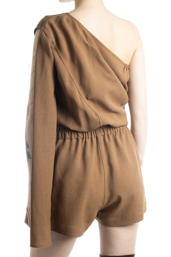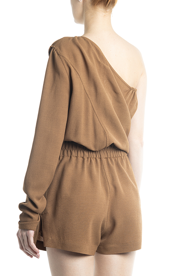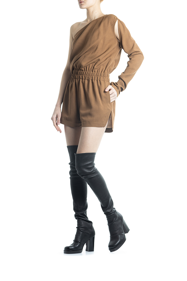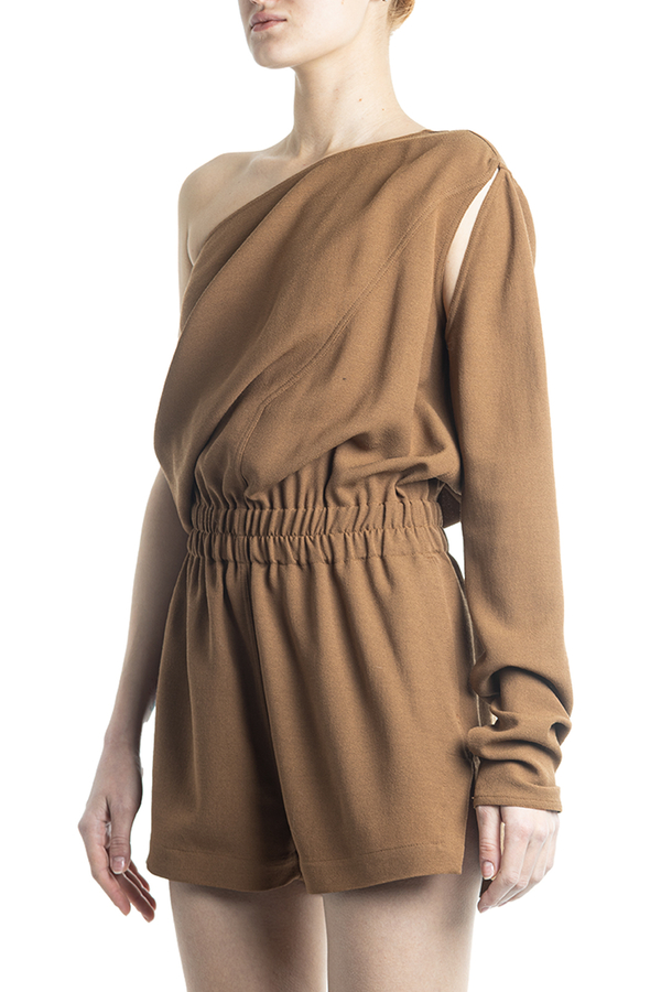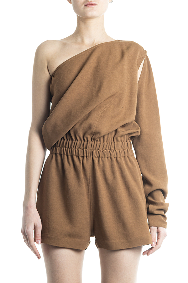 - Короткий комбінезон на одне плече. Вирізні деталі, модель на одному плечі, один рукав, еластичний пояс і прямий поділ.