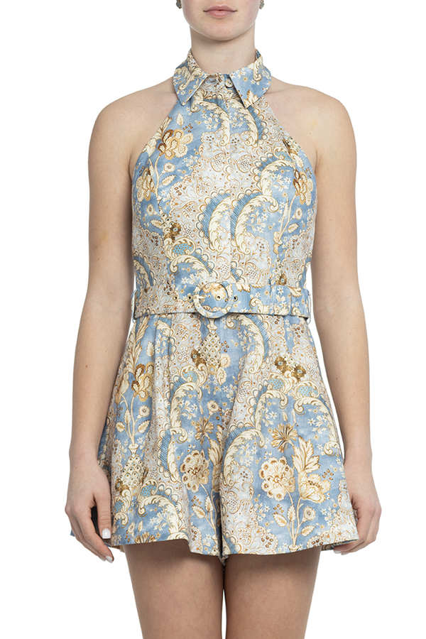 - Комбінезон з відкритими плечима, комір-халтер із частковою застібкою на гудзики спереду, знімний ремінь із пряжкою на поясі, дві прорізні кишені по боках, застібка на приховану блискавку ззаду