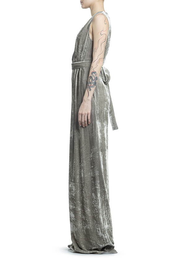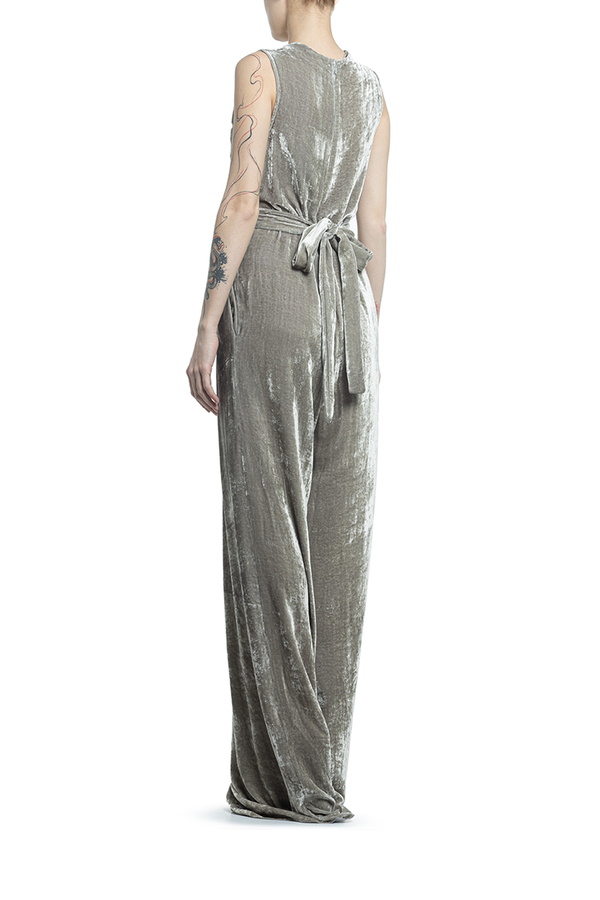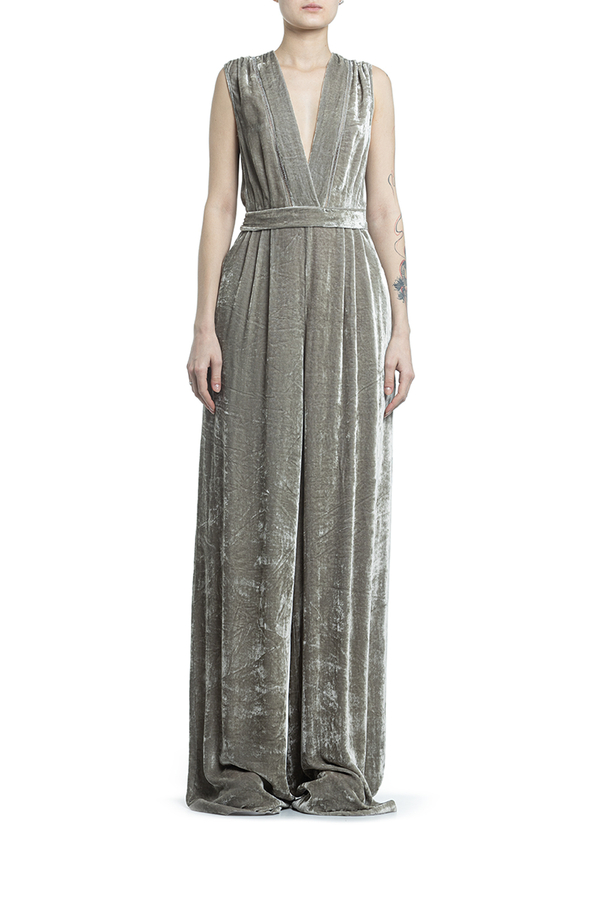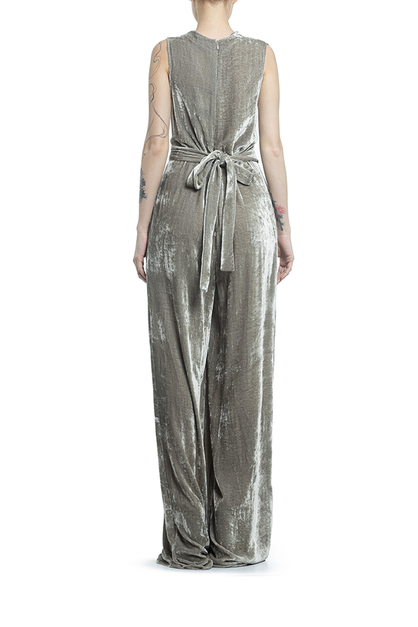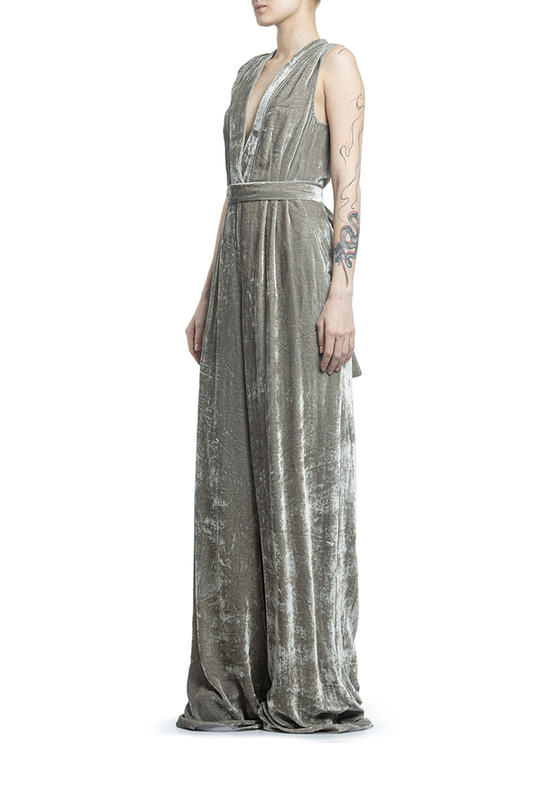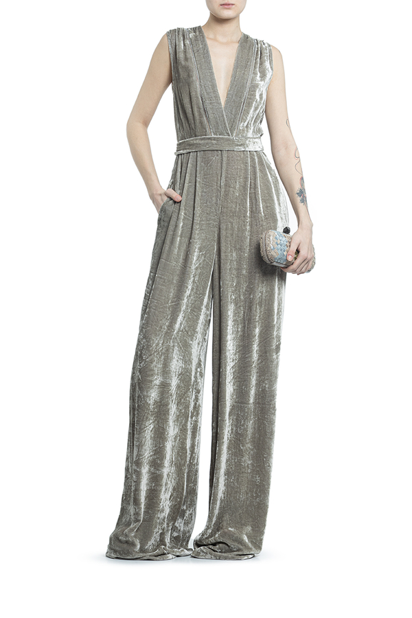 - Оксамитовий довгий комбінезон з глубоким V-подібним вирізом і без рукавів. Довгий широкий пасок з акцентом на талії. Дві бічні кишені, застібка на блискавку ззаду.