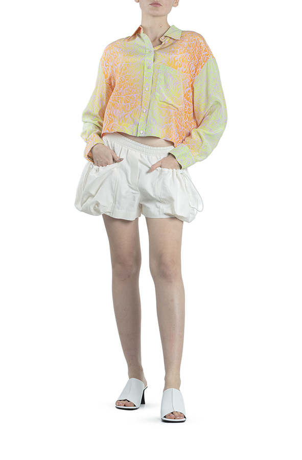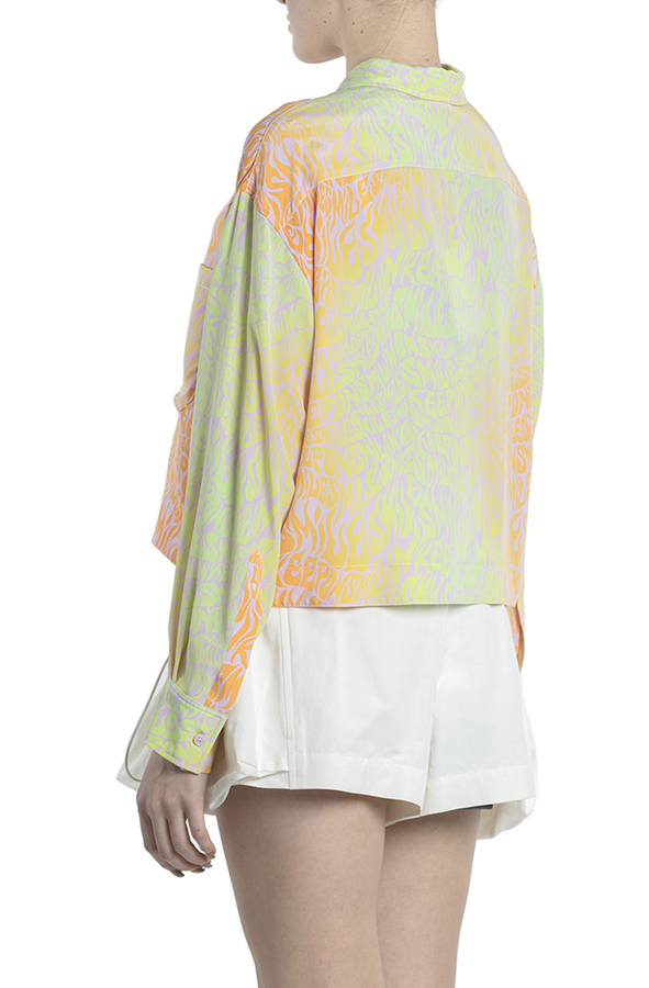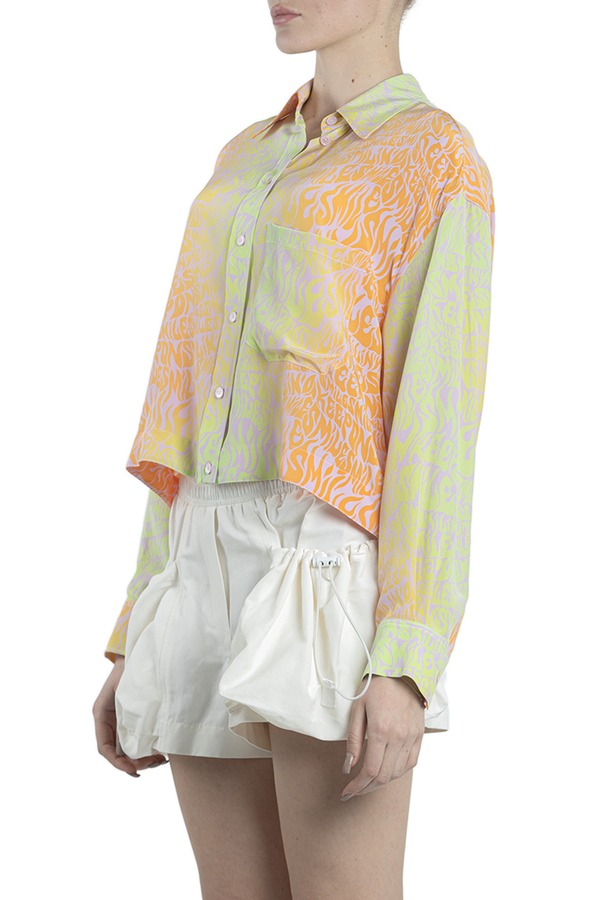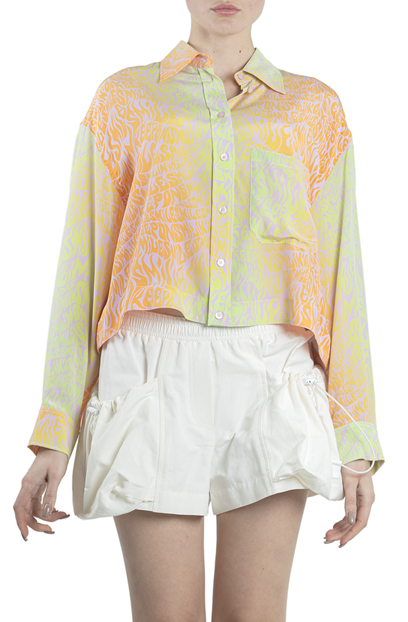 - Блуза з довгими рукавами і класичним коміром. Застібка на гудзики і накладна нагрудна кишеня.