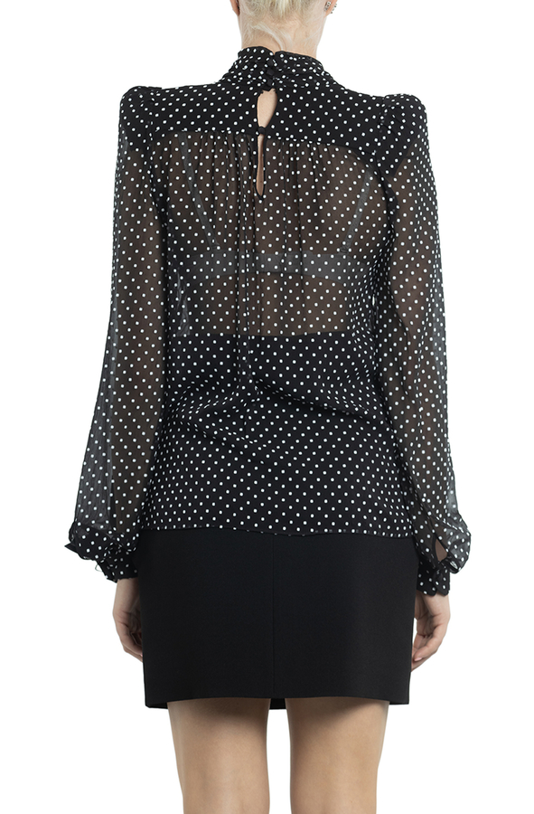 - Напівпрозора блуза в білий дрібний горох з довгими рукавами і бантом.