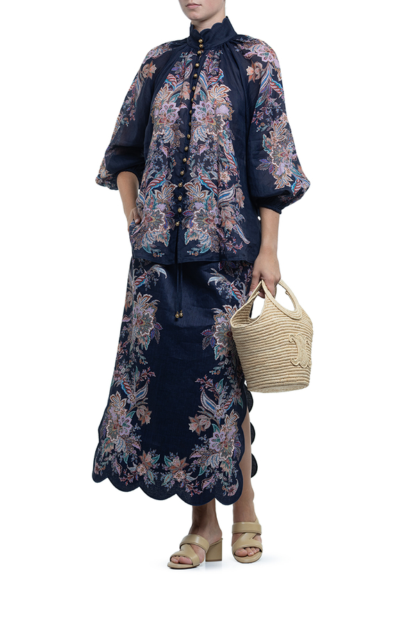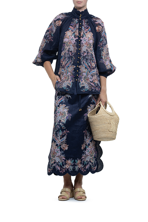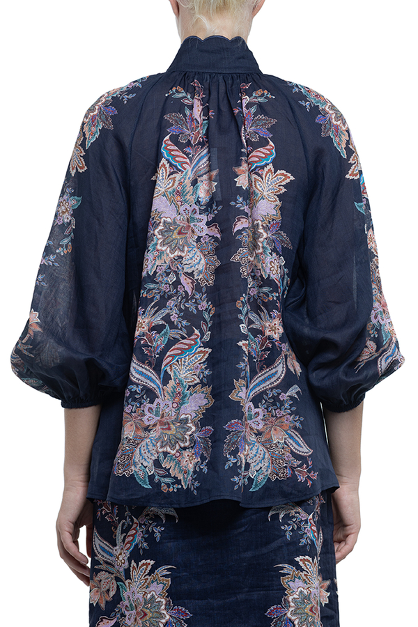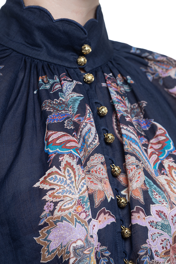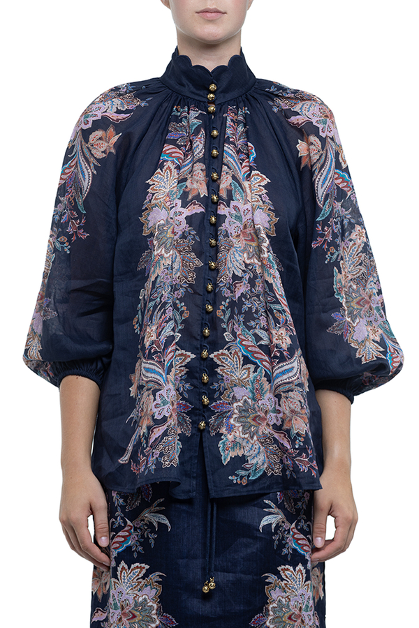 - Блуза вільного крою, високий комір з фестончастими краями, довгі рукави-ліхтарики, еластичні манжети, квітковий принт по всій довжині, застібка на золотисті гудзики-дзвіночки