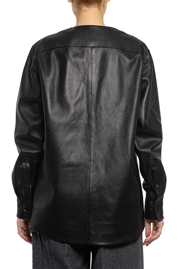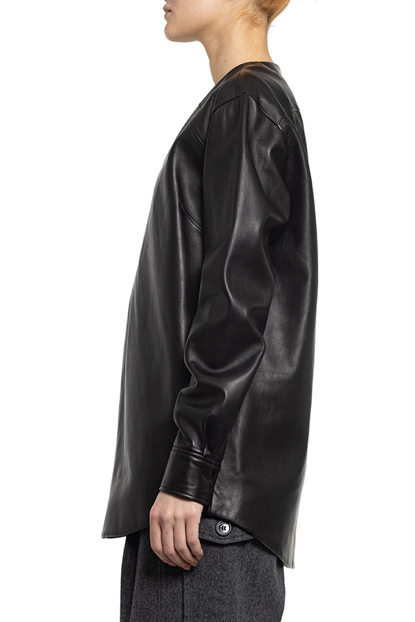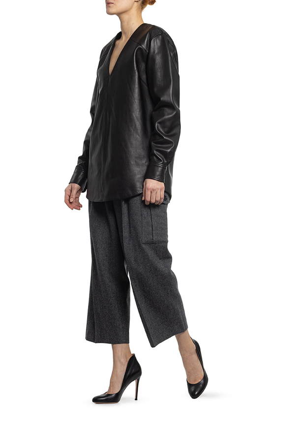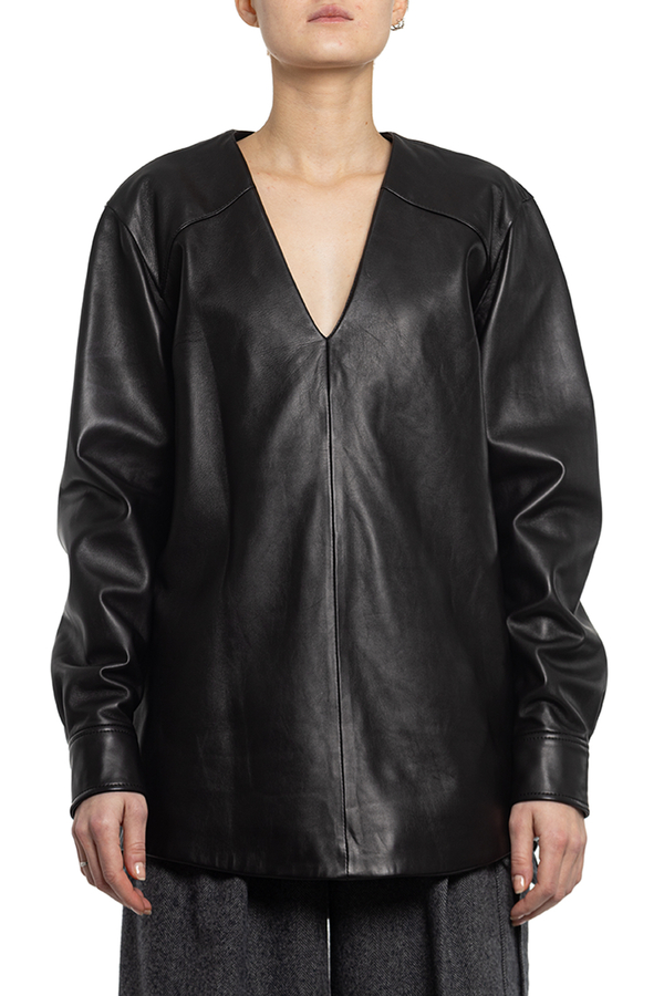 - Шкіряна блуза з V-подібним вирізом горловини, довгий рукав.