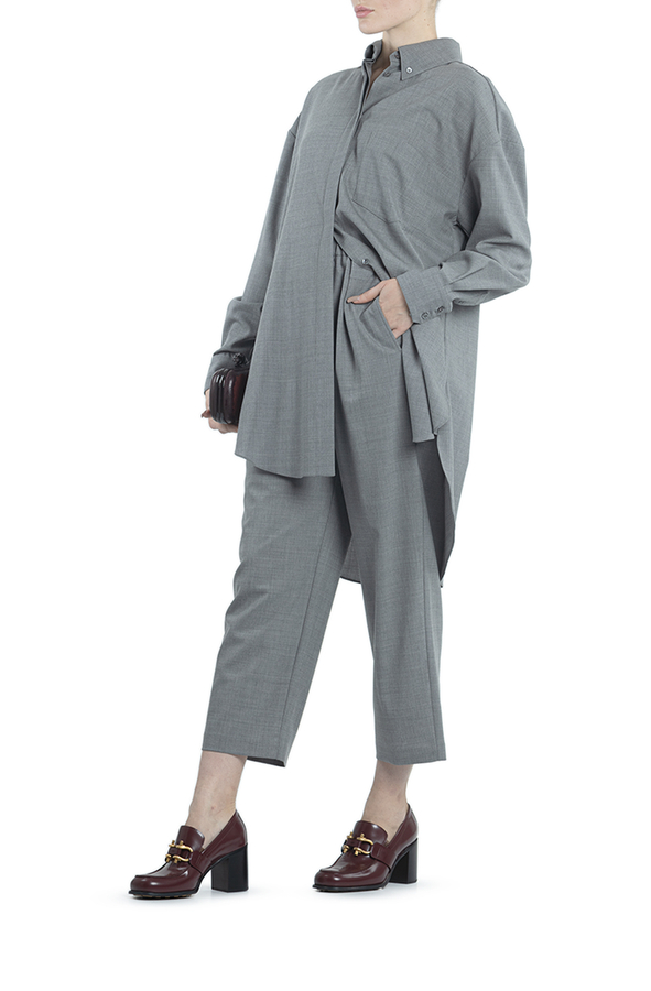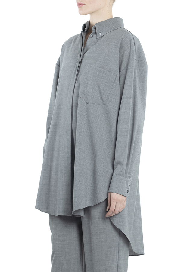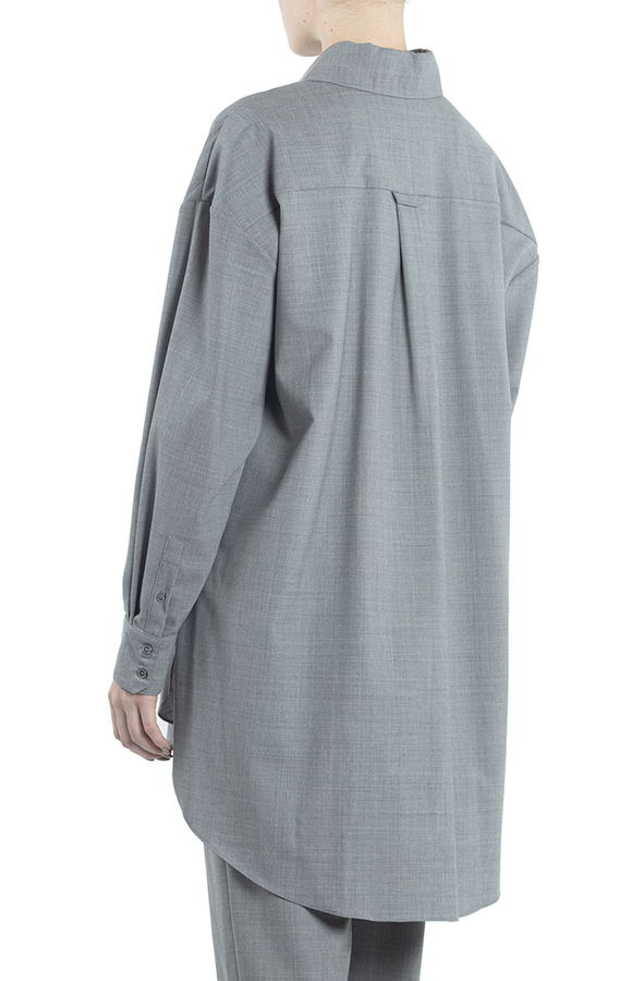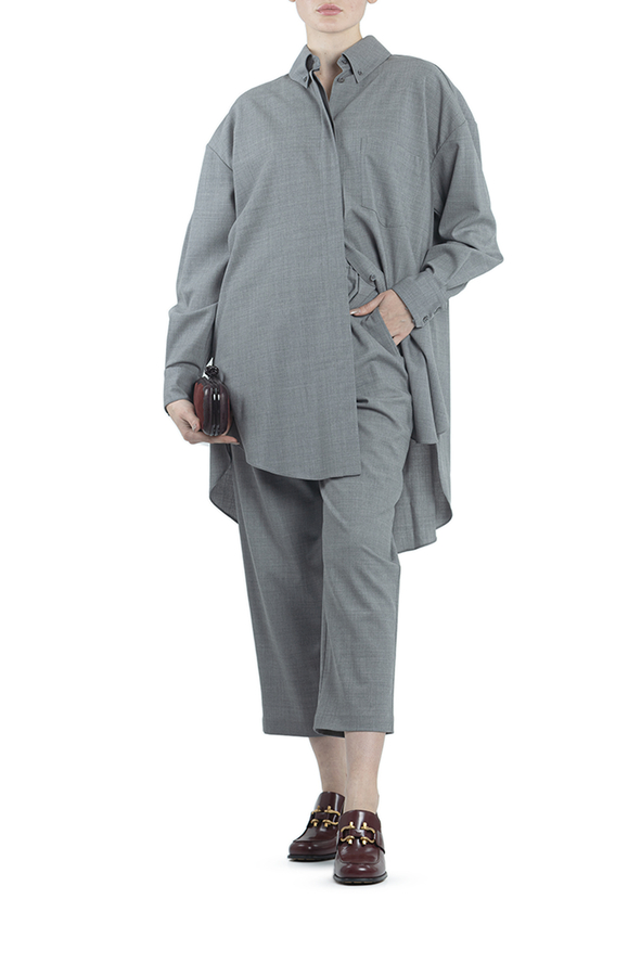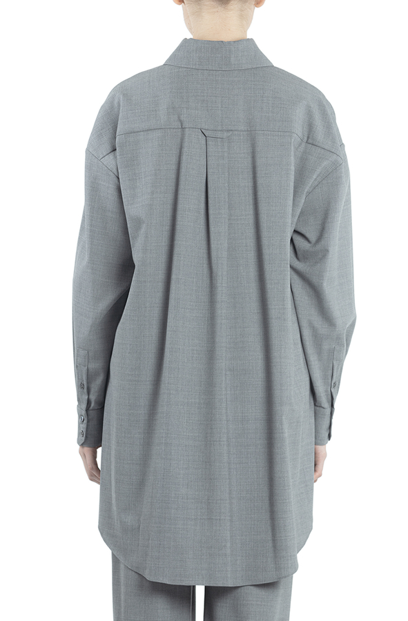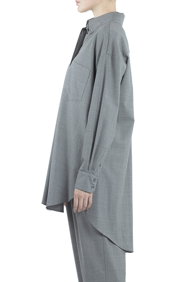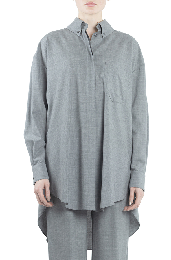 - Жіноча довга сорочка. Класичний комір, застібання на передню кнопку, довгі рукави, нагрудна кишеня, вигнутий подол.