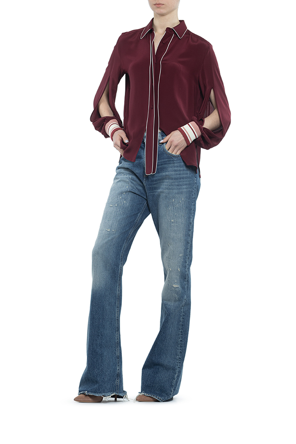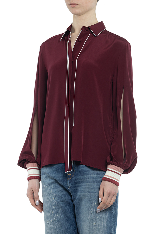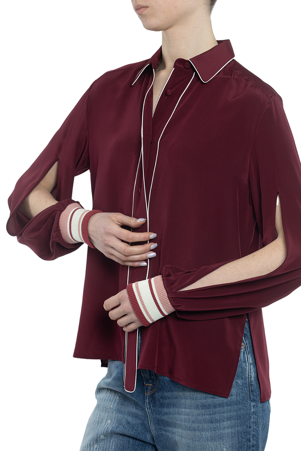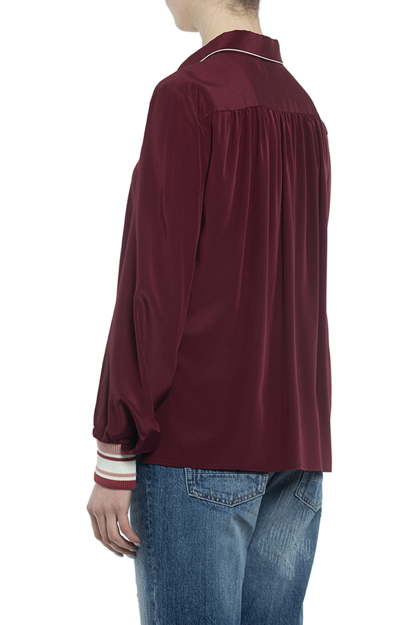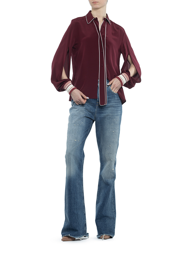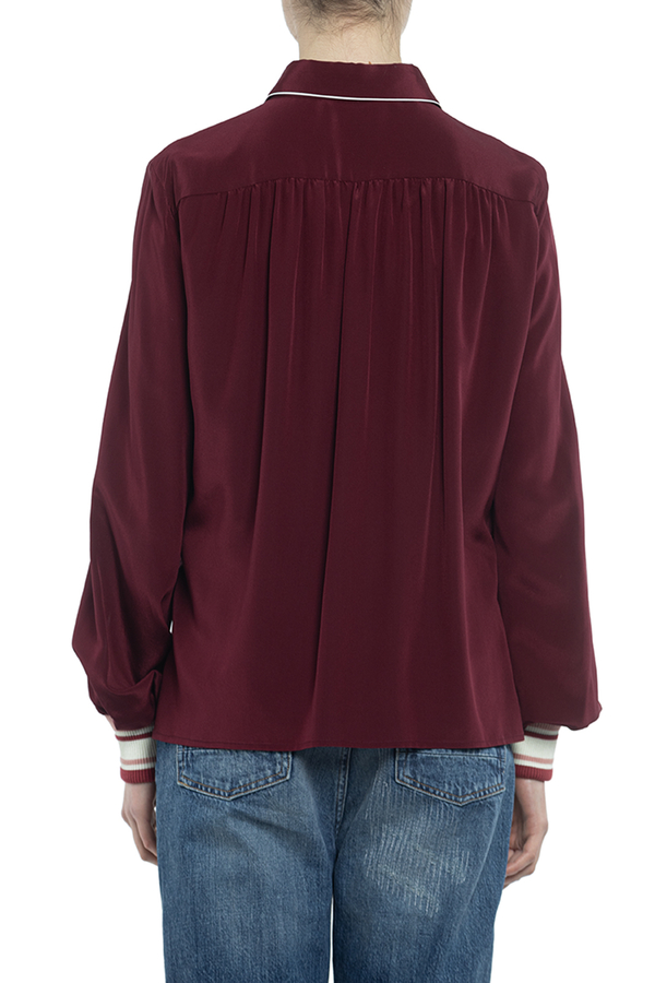 - Сорочка з довгими рукавами і на еластичних манжетах. Класичний комір, застібка на гудзики. Розрізи на рукавах і з боків. Ровний поділ.