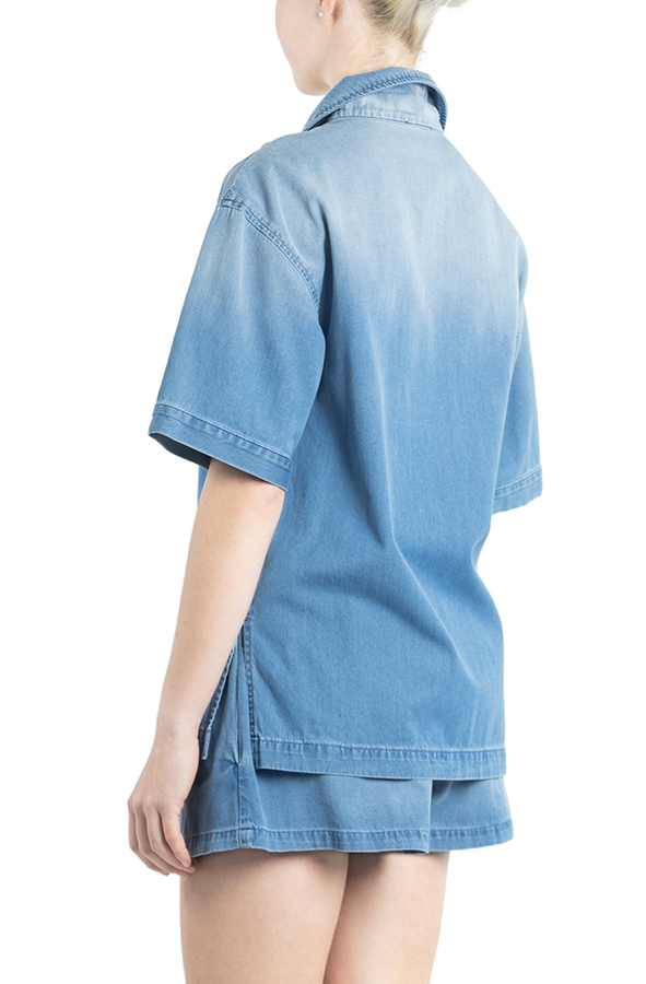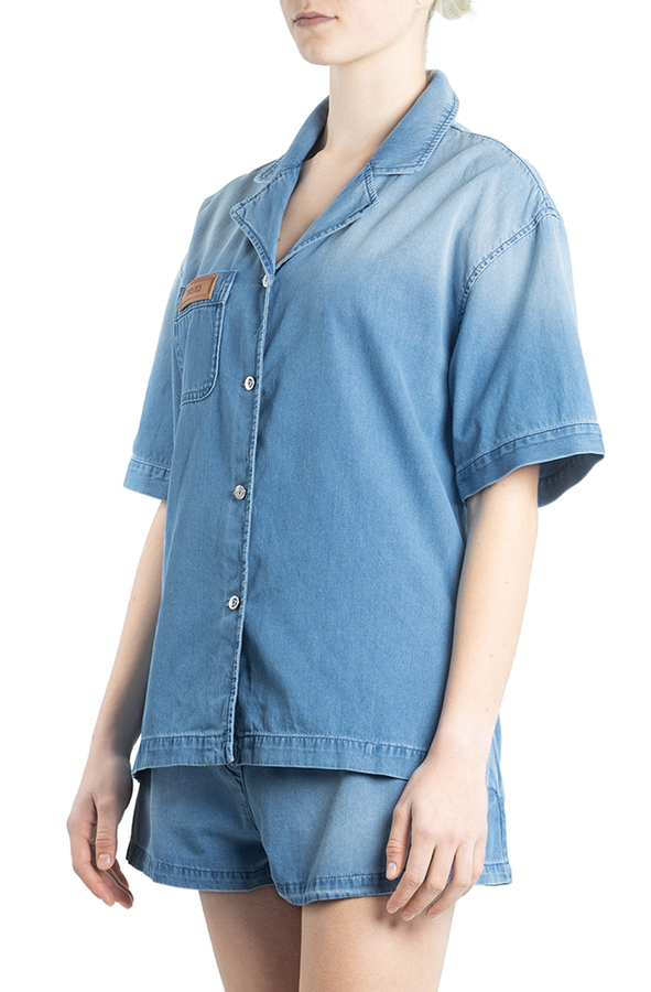 - Джинсова сорочка з короткими рукавами, ефект потертості, відкладний комір, спущене плече, застібка на фірмові гудзики з головою Медузи, накладна нагрудна кишеня з нашивкою логотипу, короткі бічні розрізи