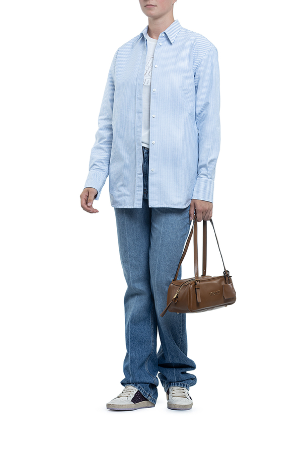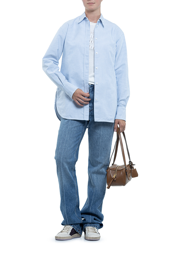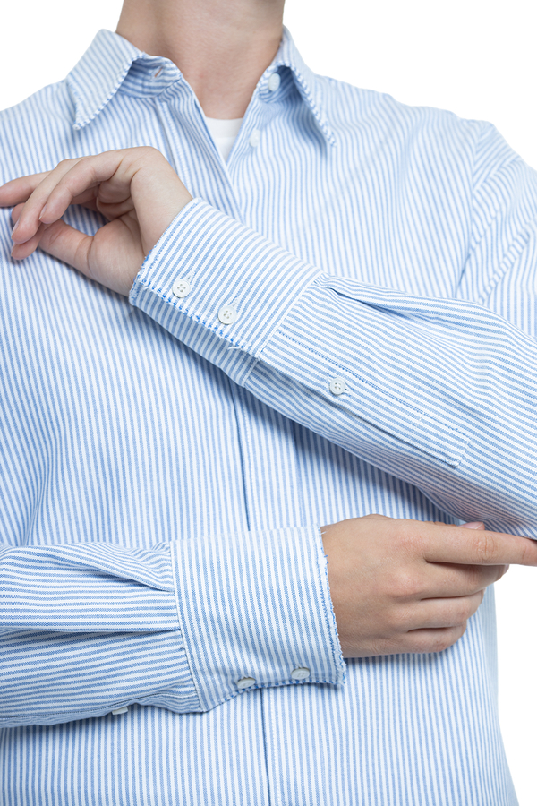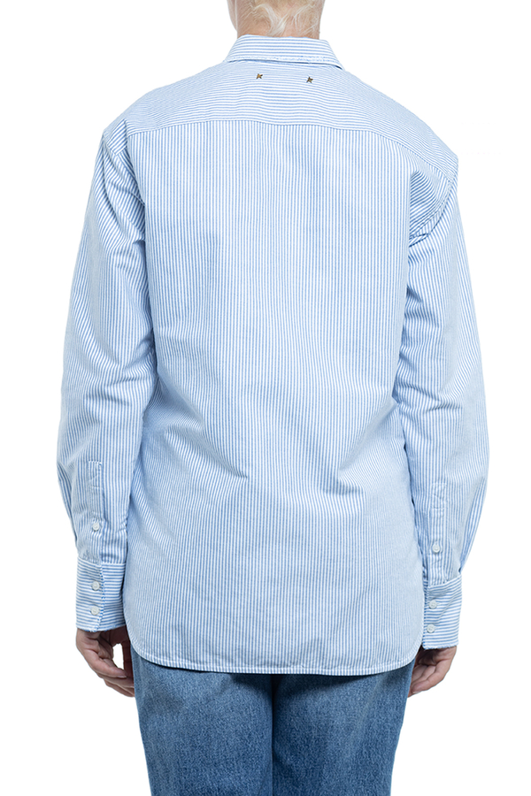 - Сорочка із блакитними смужками, довгі рукави, класичний комір, прихована застібка на гудзики, ефект потертості на комірі та манжетах, подвійна золота зірка на спині
