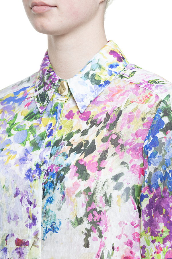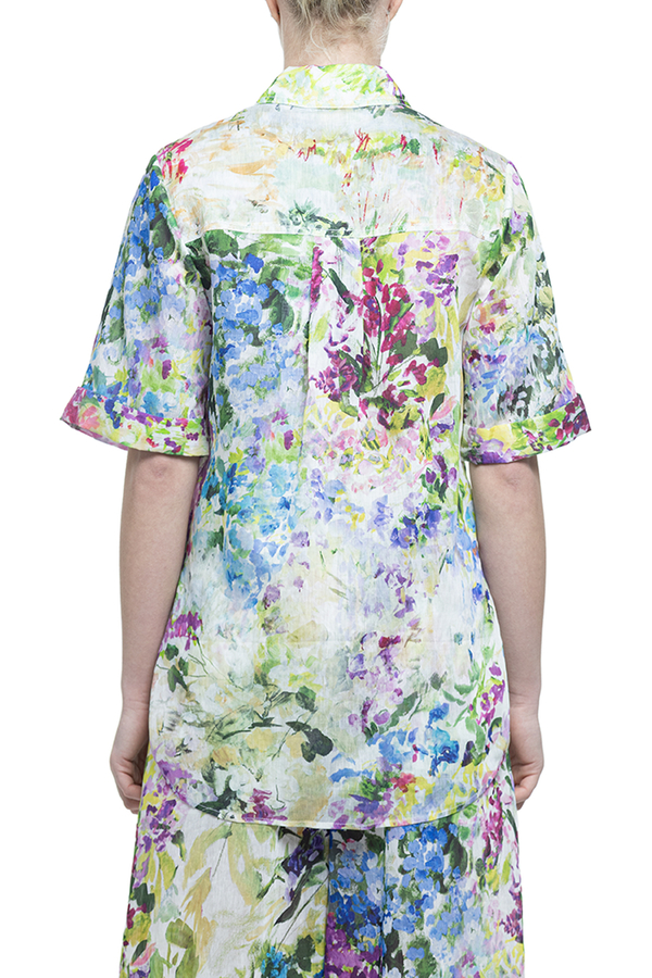 - Сорочка з квітковим принтом, короткі рукави, класичний комір, подовжений низ ззаду, розрізи по боках, застібка на гудзики