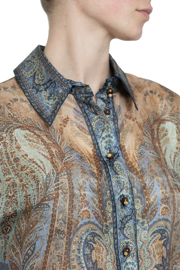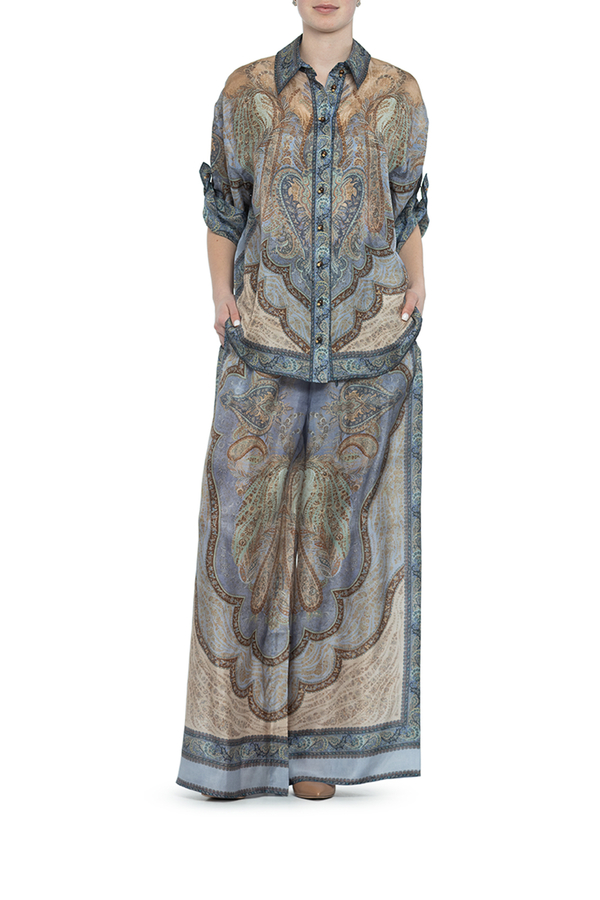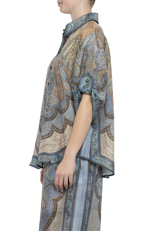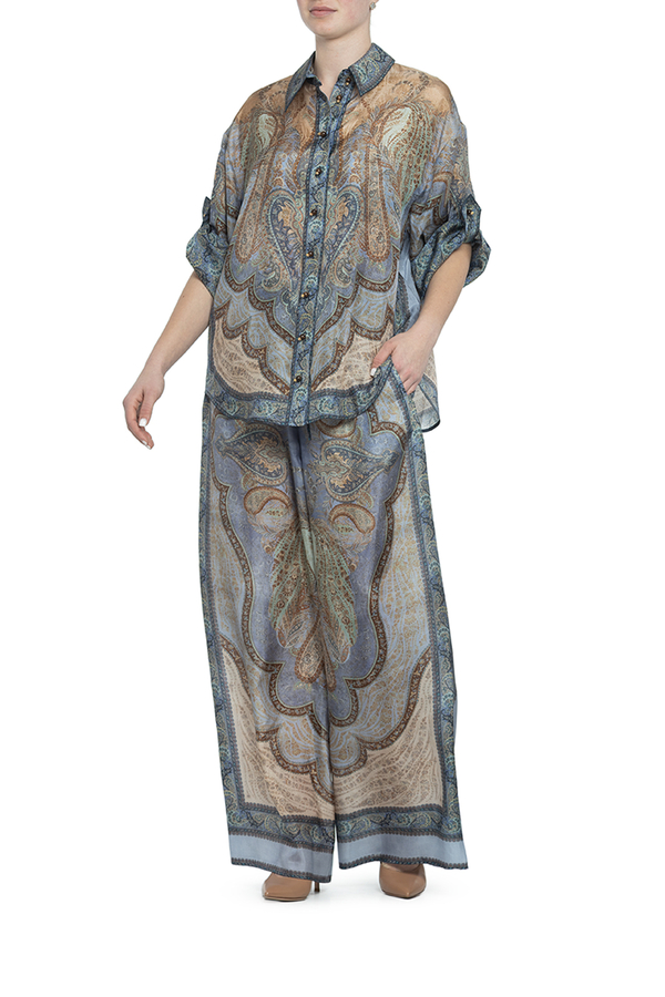 - Сорочка з класичним коміром, довгі регульовані рукави з хлястиками , багатокольоровий візерунок, асиметричний низ, застібка на гудзики