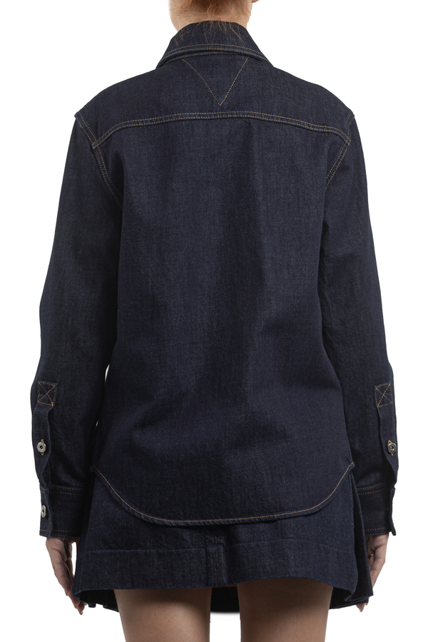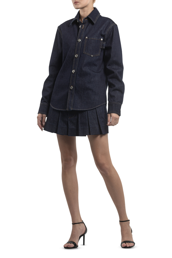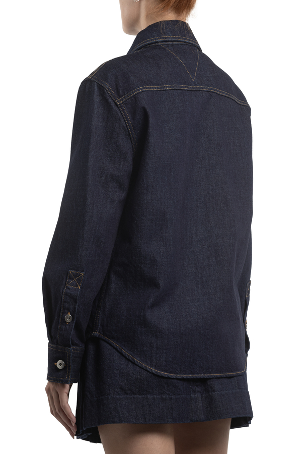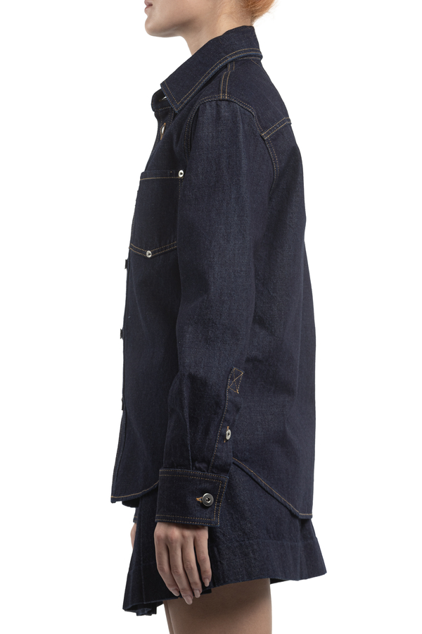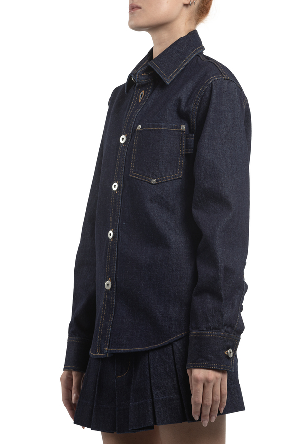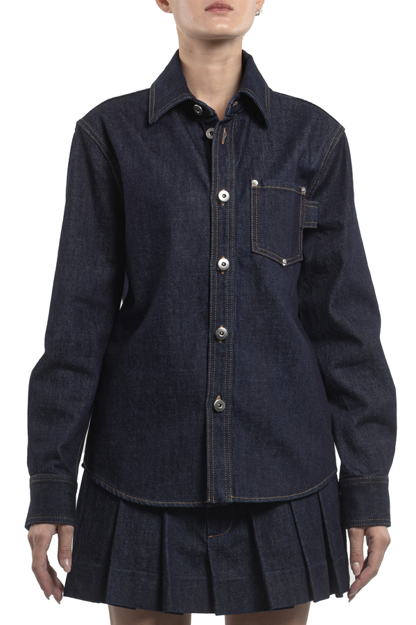 - Джинсова сорочка, контрастні шви, спереду накладний карман, застібка на гудзики