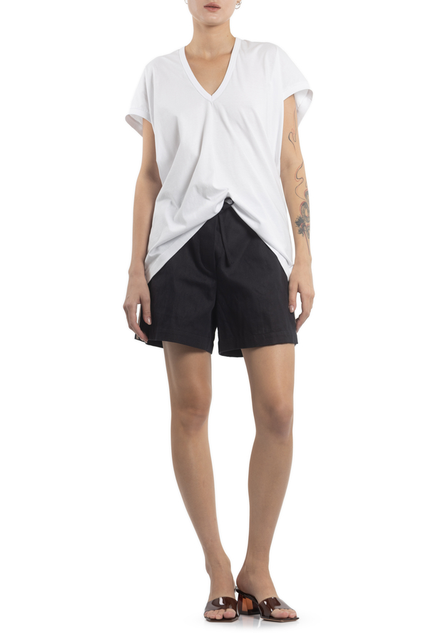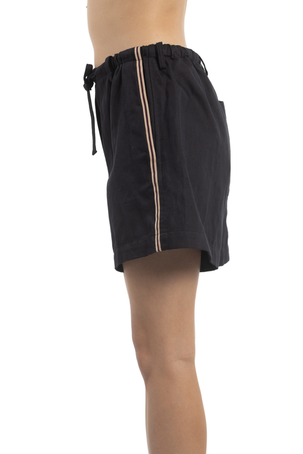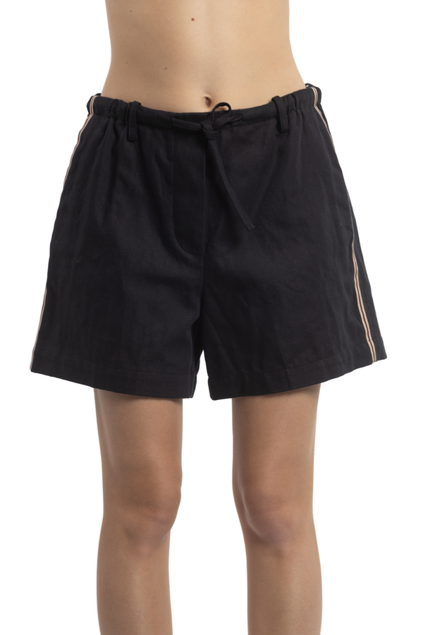 - Шорти з лампасами, еластичний пояс зі шнурком, шлевки для ременя, дві вшиті кишені з боків, накладна кишеня ззаду