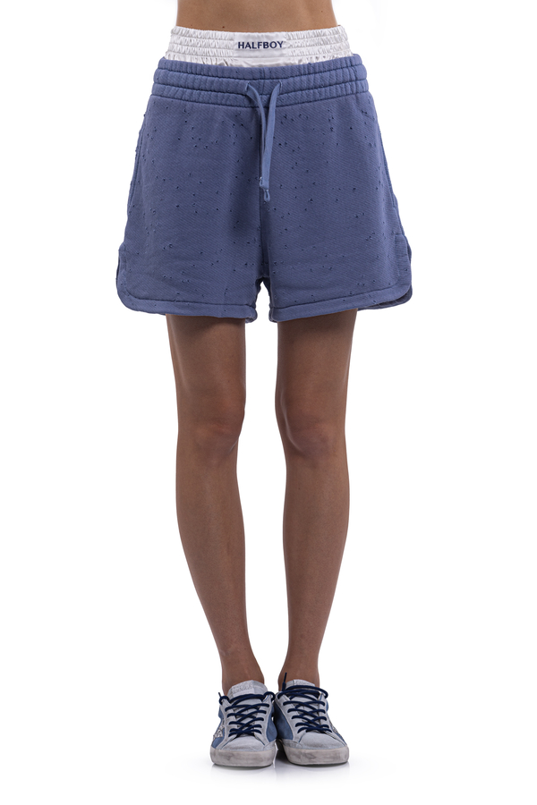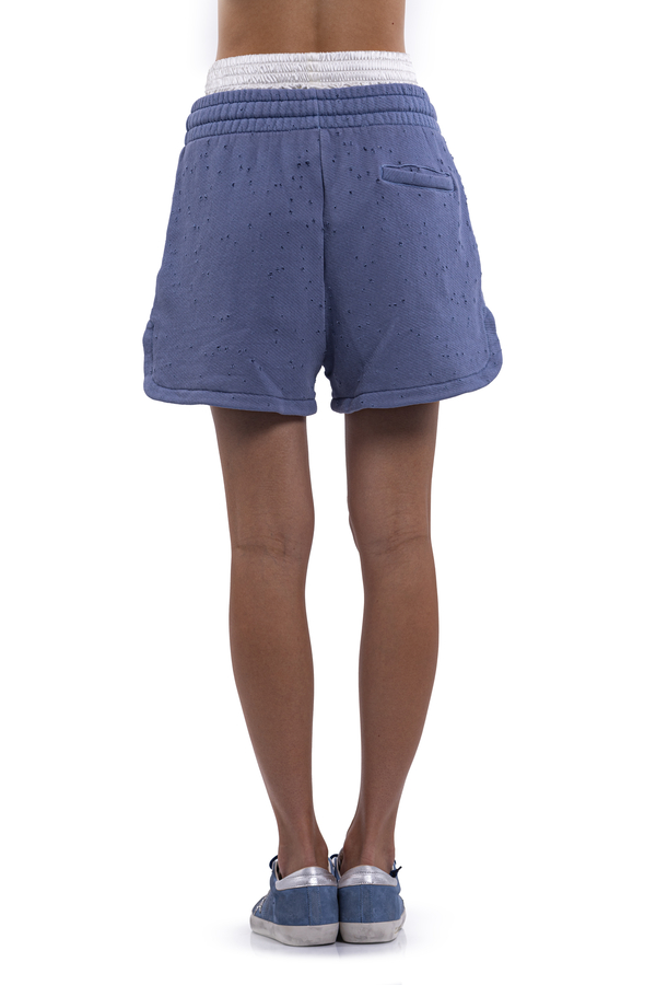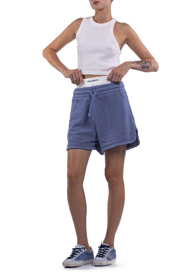 - Трикотажні шорти, подвійний еластичний пояс із вишивкою з назвою бренда, розрізи по боках, ззаду прорізна кишеня