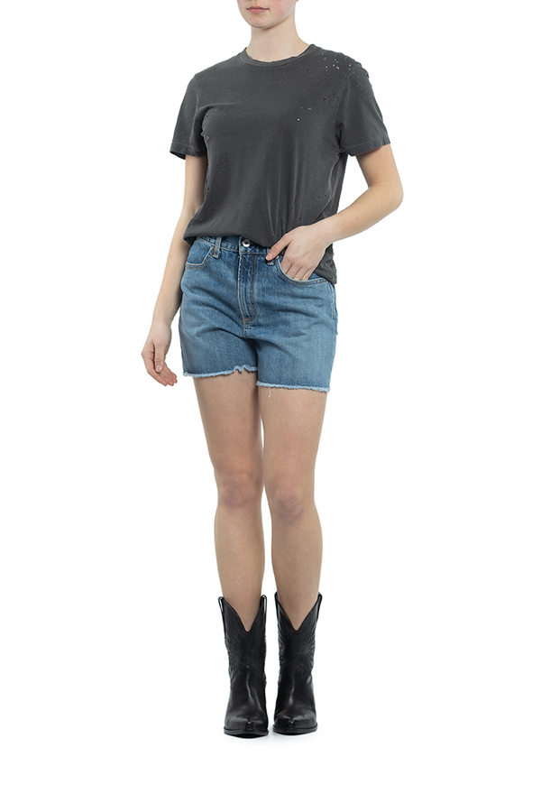 - Джинсові шорти середньої довжини. Висока талія, застібка на блискавку і гудзик.