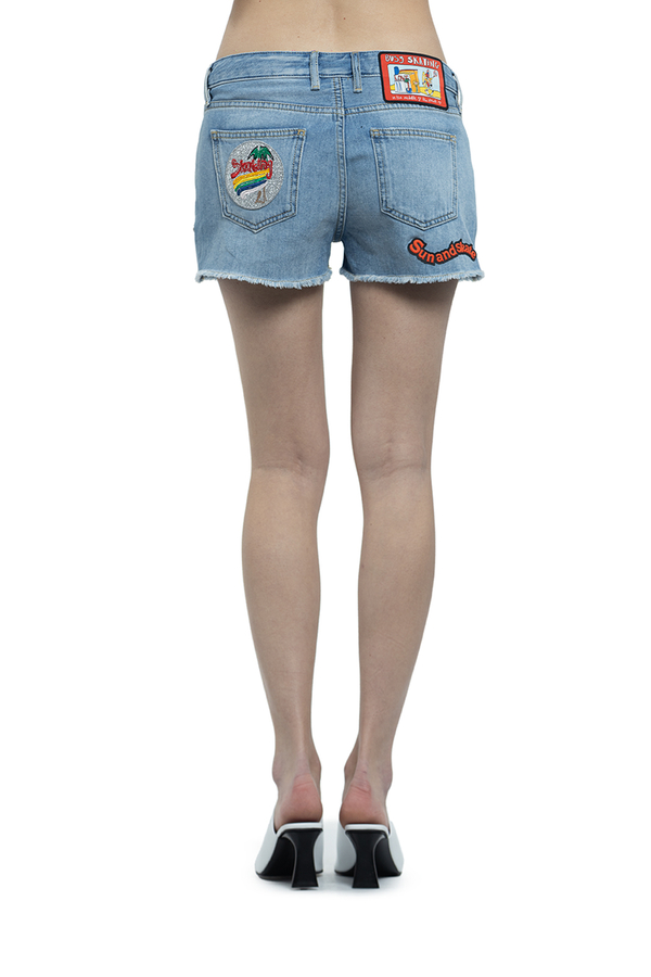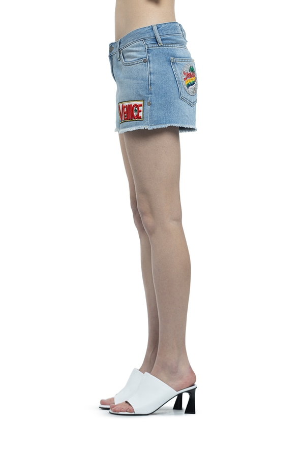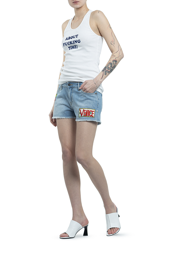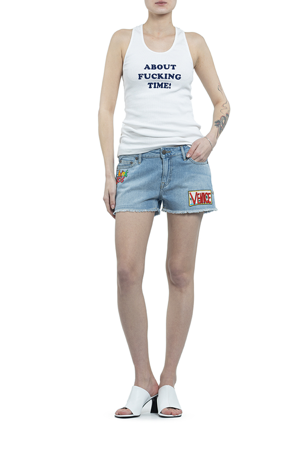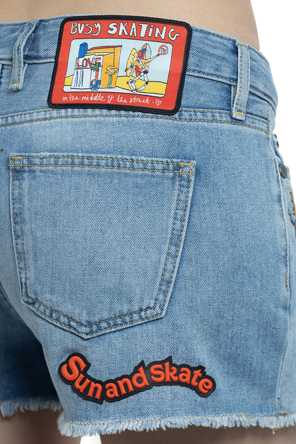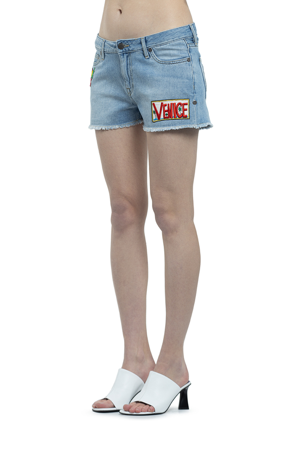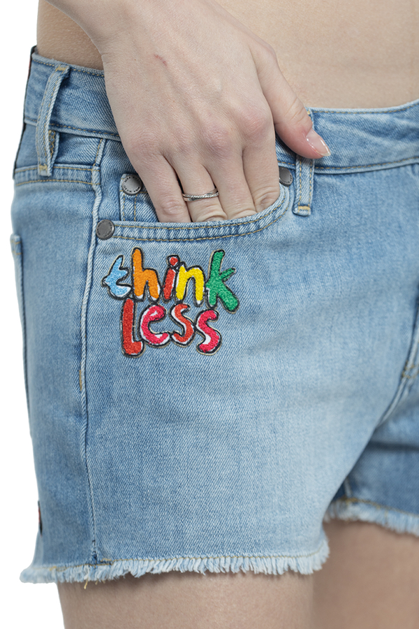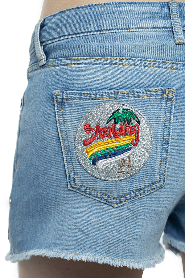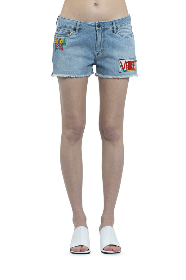 - Джинсові міні-шорти з нашивками і бахромою знизу.