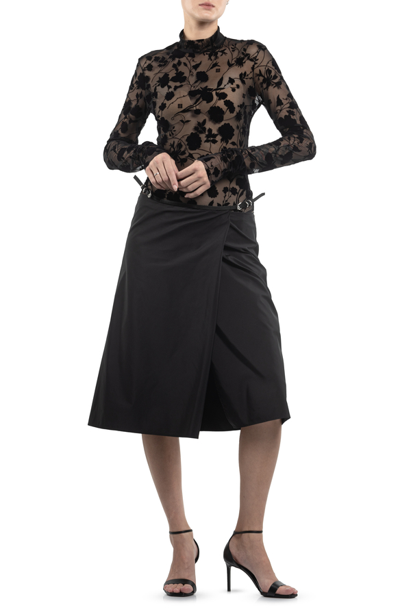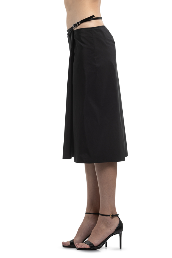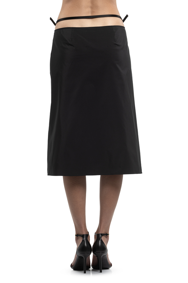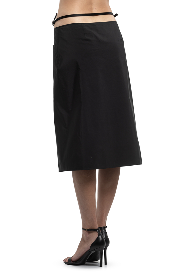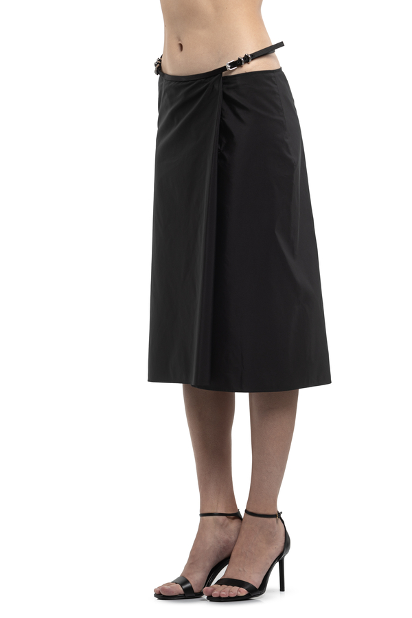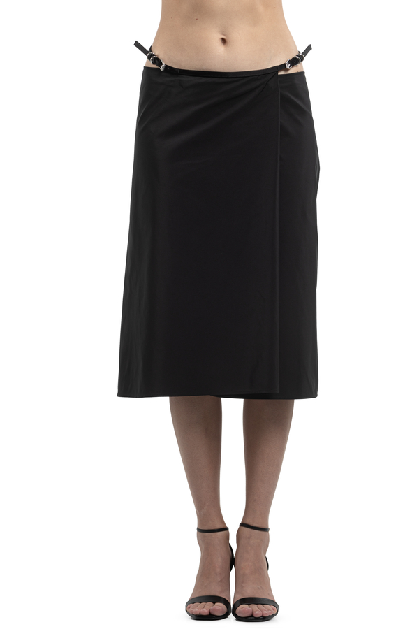 - Пряма спідниця, дизайн з обгорткою, два регульовані пояси на талії, прихована застібка спереду, без підкладки