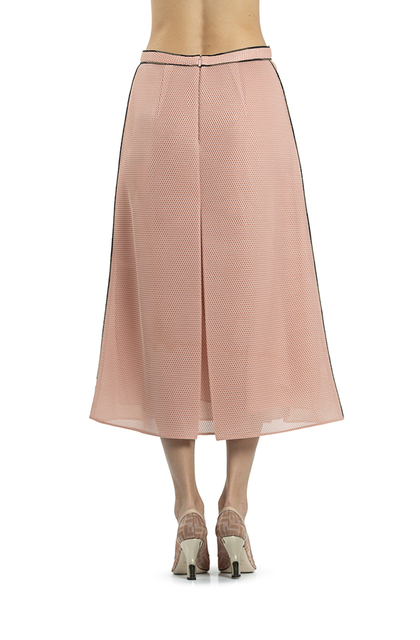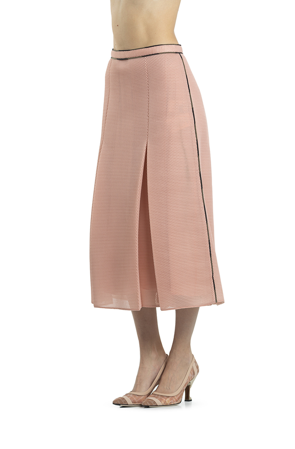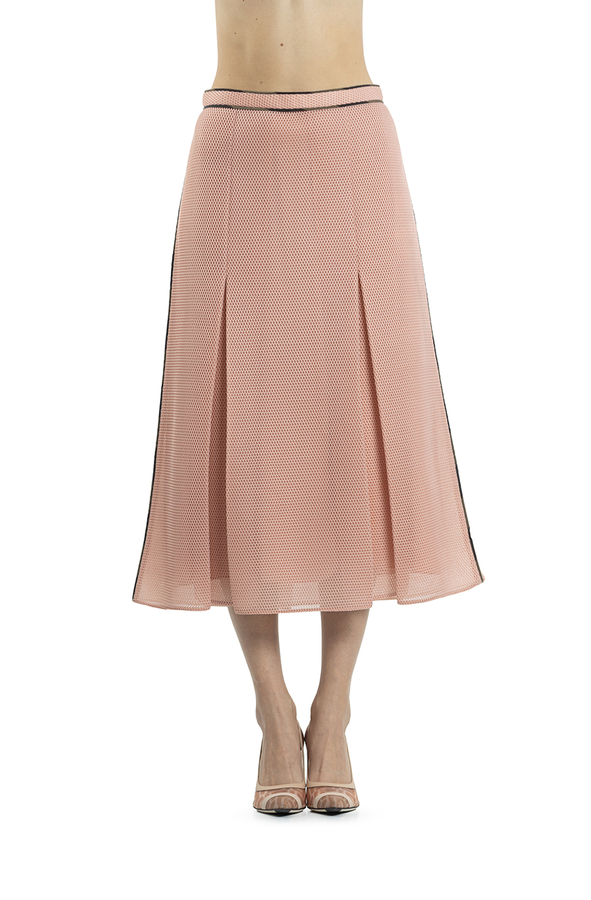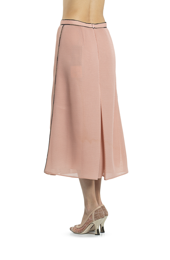 - Сітчаста спідниця середньої довжини. Завищена талія, А-подібний силует, спідниця, потаємна застібка на блискавці ззаду, деталь зі складками, панелі в сітку і контрастна окантовка.