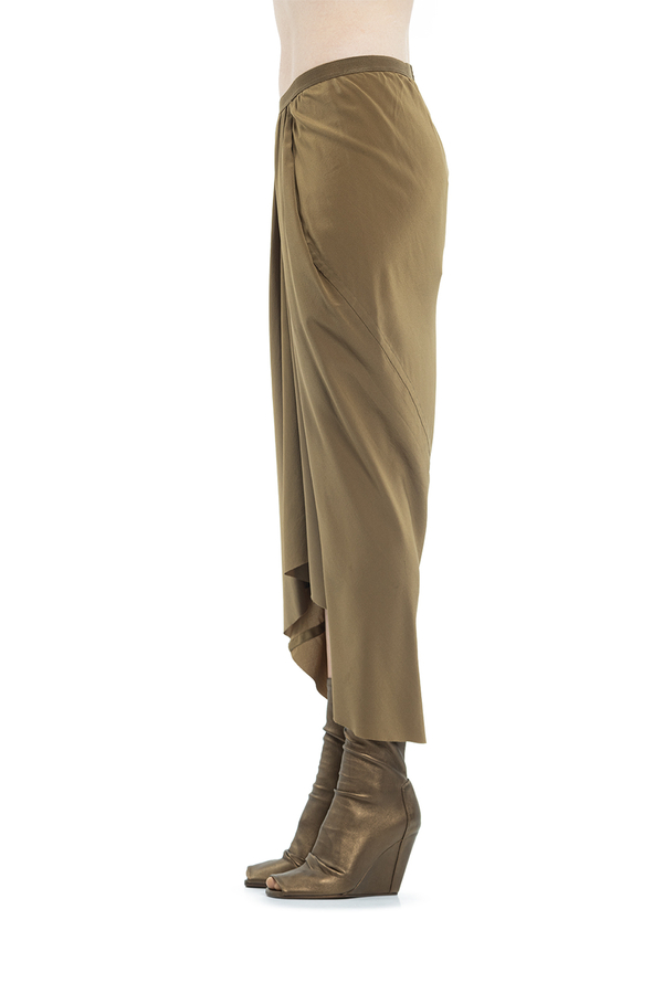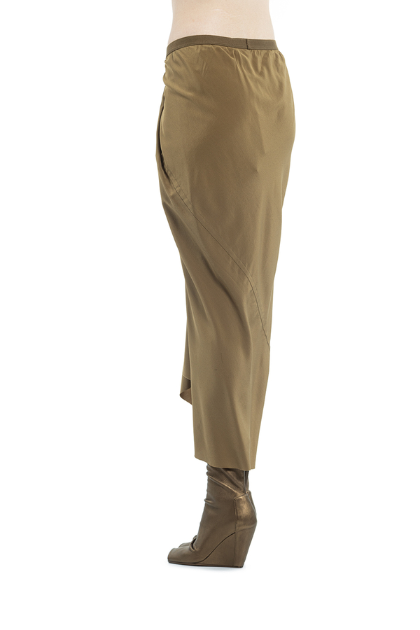 - Шовкова спідниця середньої довжини на еластичному поясі. Драпіровка спереду, бічні прорізні кишені, необроблений поділ.