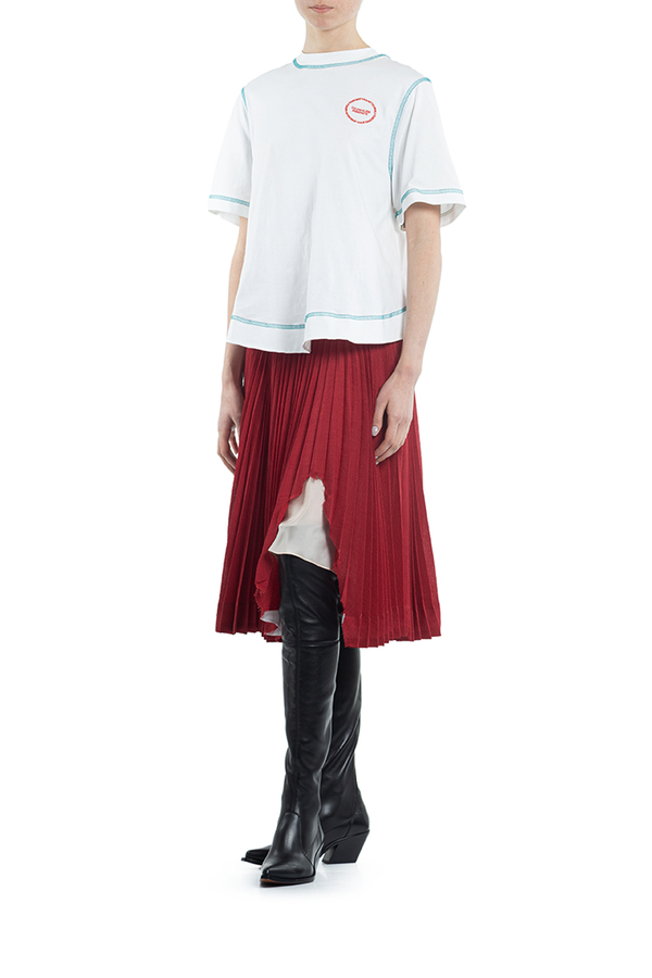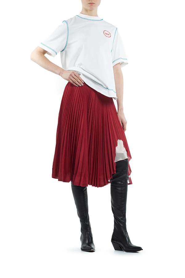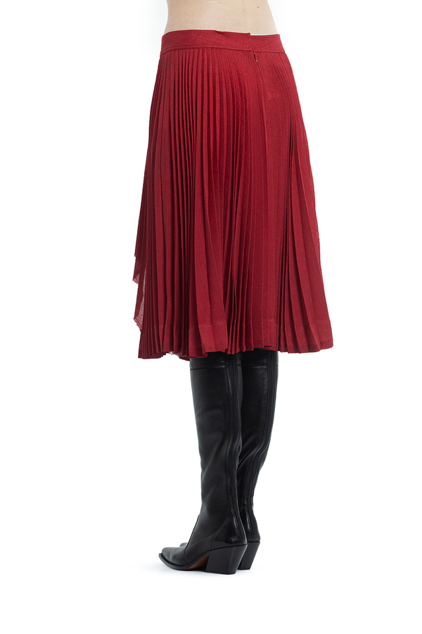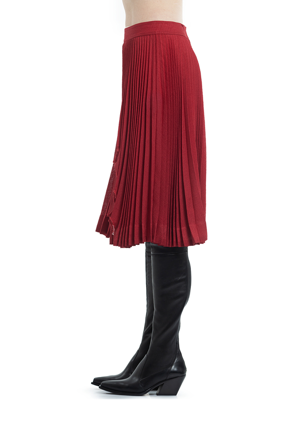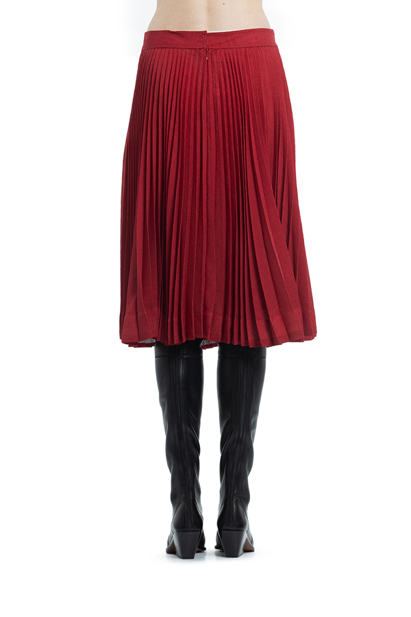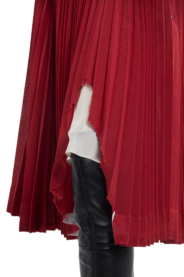 - Спідниця плісе середньої довжини. Спереду декоративний розріз з необробленим краєм. На широкому поясі с застібкою на гачки і на блискавку ззаду.