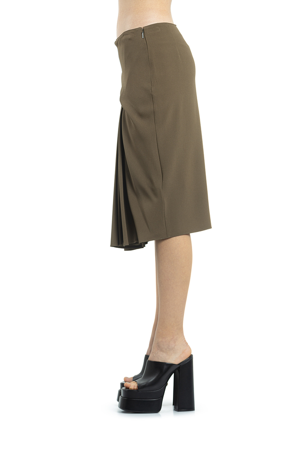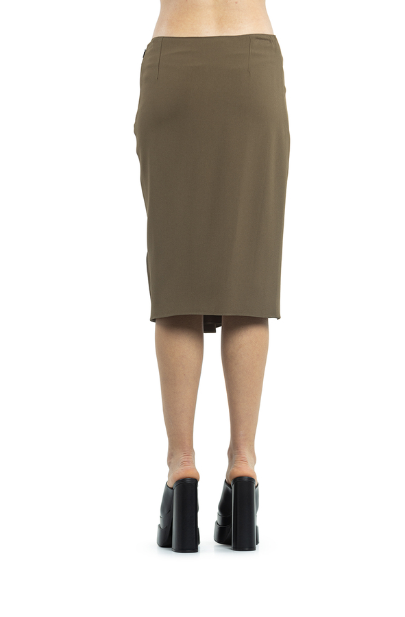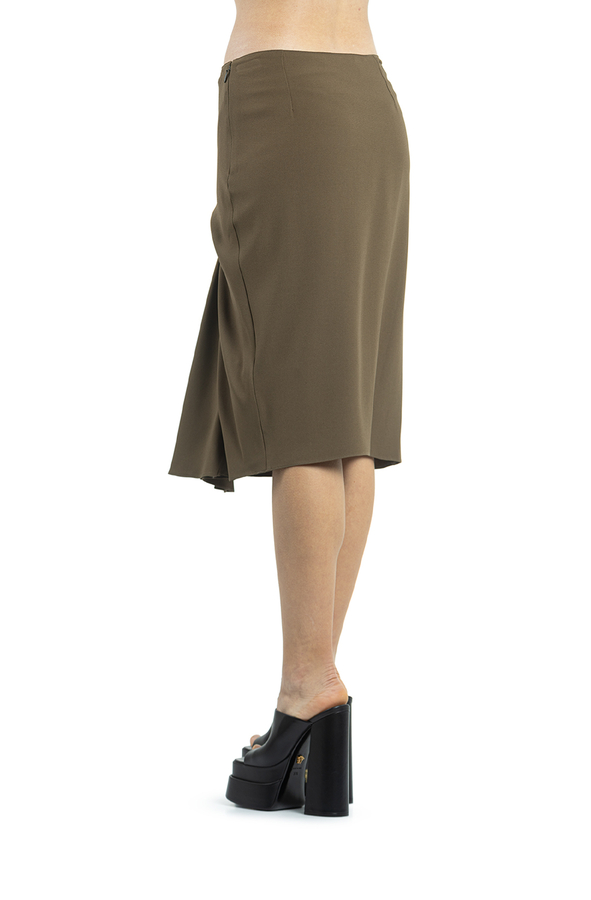 - Драпірована спідниця міді з завищеною лінією талії. Потайна застібка на блискавці збоку, довжина по коліно.