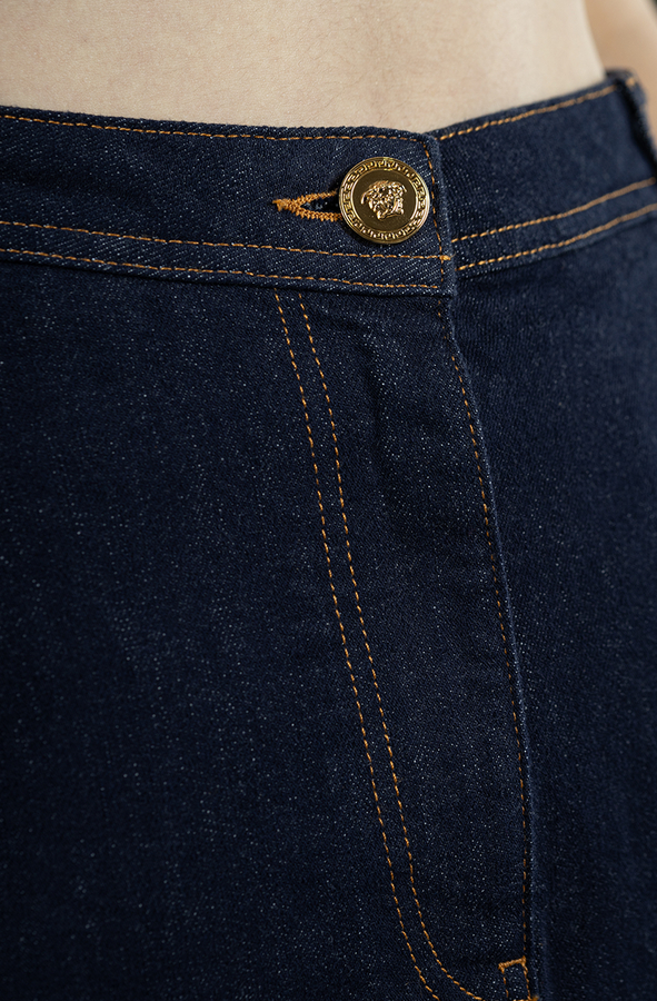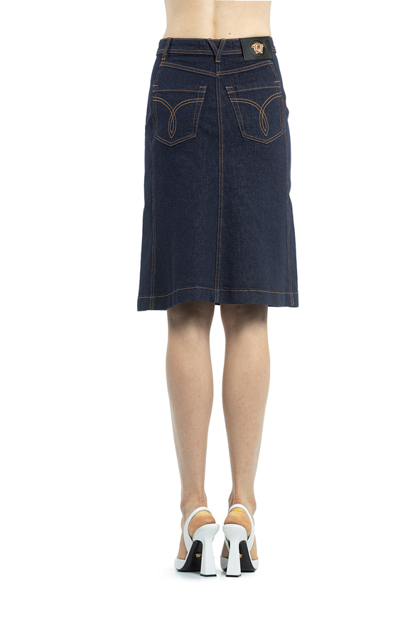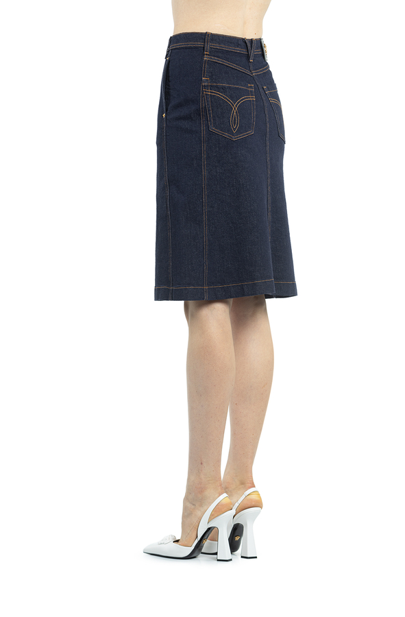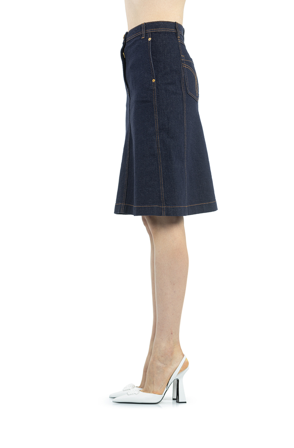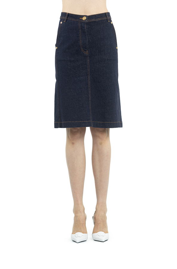 - Універсальна спідниця з темного деніму, середньої довжини, трапецієподібної форми.